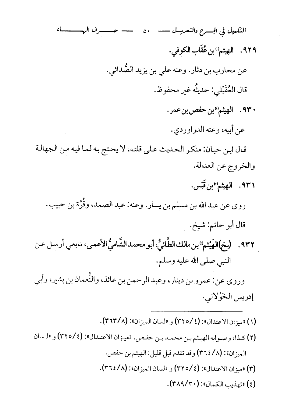 932 - (بخ) الهَيْثم (¬4) بن مالك الطَّائيُّ، أبو محمد الشَّاميُّ الأعمى، تابعي أرسل عن النبي صلى الله عليه وسلم.