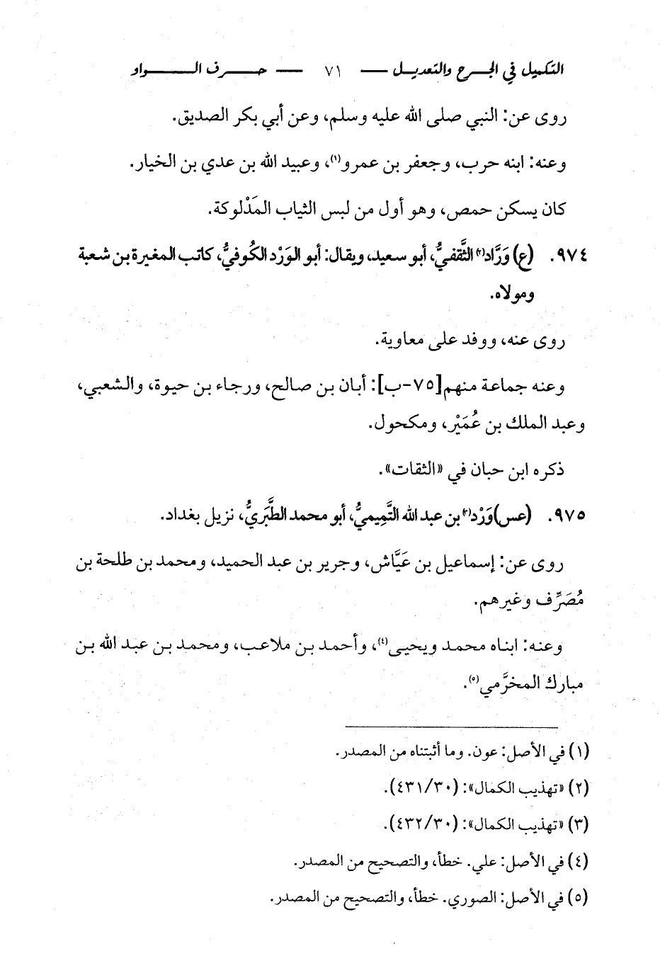 974 - (ع) وَرَّاد (¬2) الثَّقفيُّ، أبو سعيد، ويقال: أبو الوَرْد الكُوفيُّ، كاتب المغيرة بن شعبة ومولاه.