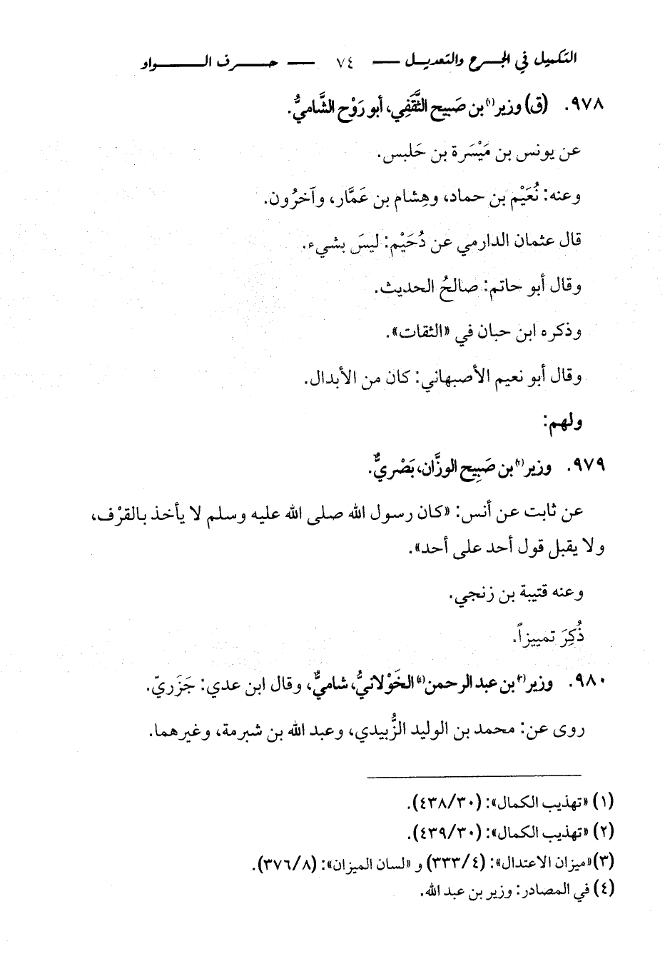 980 - وزير (¬3) بن عبد الرحمن (¬4) الخَوْلانيُّ، شاميٌّ، وقال ابن عدي: جَزَريّ.