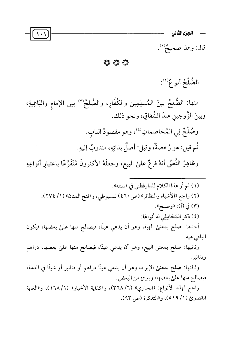 وثالثها: صلح بمعنى الإبراء، وهو أن يدعي عيبًا دراهم أو دنانير أو شيئًا في الذمة، فيصالح منها على بعضها، ويبرئ من البعض.