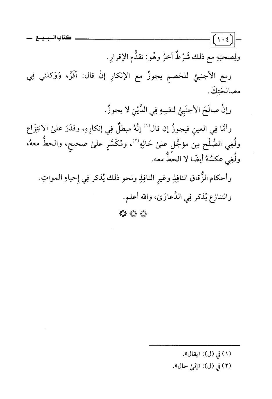 وأمَّا فِي العينِ فيجوزُ إن قال (¬1) إنَّهُ مبطلٌ فِي إنكارِهِ، وقدَرَ على الانتِزَاع ولُغِي الصُّلْح مِن مؤجَّلٍ على حَالِهِ (¬2)، ومُكَسَّرٍ على صحيحٍ، والحطُّ معهُ، ولُغِي عكسُهُ أيضًا لا الحطُّ معه.