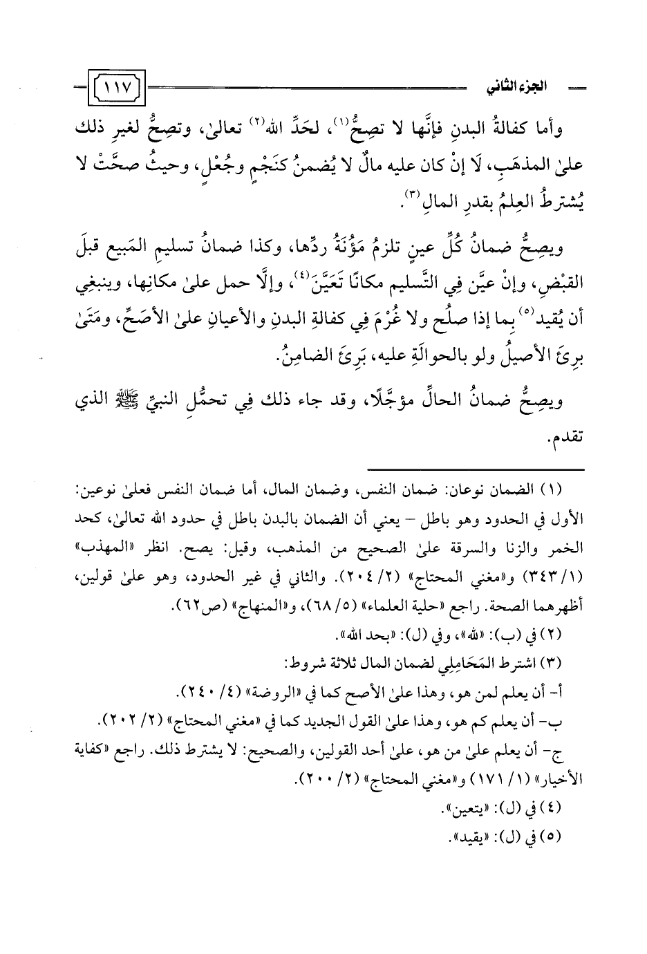 (¬1) الضمان نوعان: ضمان النفس، وضمان المال، أما ضمان النفس فعلى نوعين: الأول في الحدود وهو باطل -يعني أن الضمان بالبدن باطل في حدود اللَّه تعالى، كحد الخمر والزنا والسرقة على الصحيح من المذهب، وقيل: يصح. انظر "المهذب" (1/ 343) و"مغني المحتاج" (2/ 204). والثاني في غير الحدود، وهو على قولين، أظهرهما الصحة. راجع "حلية العلماء" (5/ 68)، و"المنهاج" (ص 62).