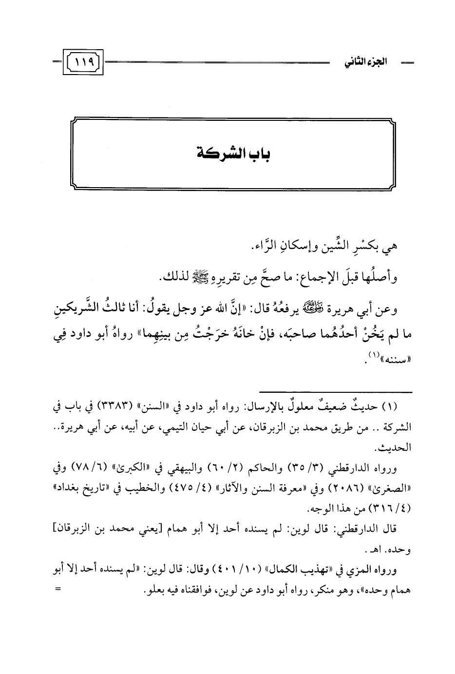 (¬1) حديثٌ ضعيفٌ معلولٌ بالإرسال: رواه أبو داود في "السنن" (3383) في باب في الشركة. . من طريق محمد بن الزبرقان، عن أبي حيان التيمي، عن أبيه، عن أبي هريرة. . الحديث.