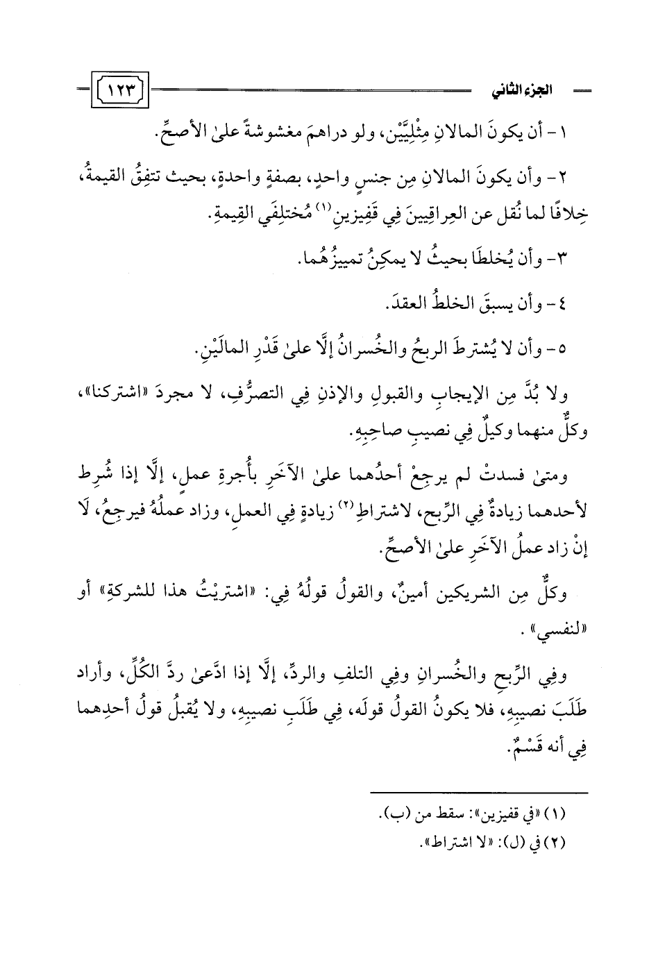 ولا بُدَّ مِن الإيجابِ والقبولِ والإذنِ فِى التصرُّفِ، لا مجردَ "اشتركنا"، وكلٌّ منهما وكيلٌ فِي نصيبِ صاحِبِهِ.