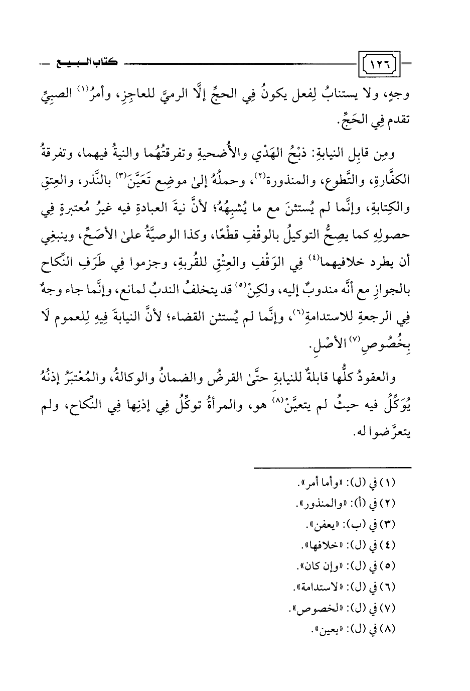 ومِن قابِل النيابةِ: ذبْحُ الهَدْي والأُضحيةِ وتفرقتُهُما والنيةُ فيهما، وتفرقةُ الكفَّارةِ، والتَّطوع، والمنذورة (¬2)، وحملُهُ إلى موضِع تَعَيَّنَ (¬3) بالنَّذر، والعِتقِ والكِتابةِ، وإنَّما لم يُستثنَ مع ما يُشبِهُهُ؛ لأنَّ نيةَ العبادةِ فيه غيرُ مُعتبرةٍ فِي حصولِهِ كما يصِحُّ التوكيلُ بالوقْفِ قطْعًا، وكذا الوصيَّةُ على الأصَحِّ، وينبغِي أن يطرد خلافيهما (¬4) فِي الوَقْفِ والعِتْقِ للقُربةِ، وجزموا فِي طَرَفِ النِّكاح بالجوازِ مع أنَّه مندوبٌ إليه، ولكِنْ (¬5) قد يتخلفُ الندبُ لمانع، وإنَّما جاء وجهٌ فِي الرجعةِ للاستدامةِ (¬6)، وإنَّما لم يُستثن القضاء، لأنَّ النيابةَ فِيهِ لِلعموم لَا بِخُصُوصِ (¬7) الأصْلِ.