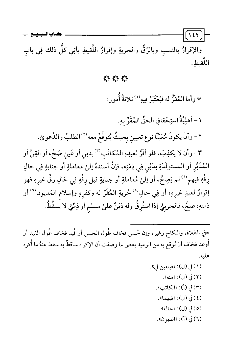 3 - وأن لا يكذِبَ، فلو أقَرَّ لعبدِهِ المُكاتَبِ (¬3) بدينٍ أو عَينٍ صَحَّ، أو القِنِّ أو المُدَبَّرِ أو المستولَدَةِ بدَيْنٍ فِي ذِمَّتِه، فإنْ أسندهُ إلى معاملةٍ أو جنايةٍ فِي حالِ رِقِّهِ فيهم (¬4) لم يَصِحَّ، أو إلى مُعاملةِ أو جنايةٍ قبل رِقِّهِ فِي حَالِ رقِّ غيرِهِ فهو إقرارٌ لعبدِ غيرِهِ، أو فِي حالِ (¬5) حُريةِ المُقَرِّ له وكفرِهِ وإسلامِ المَديون (¬6) أو ذمتهِ، صحَّ، فالحربِيُّ إذا استُرِقَّ وله دَيْنٌ على مسلمٍ أو ذِمِّيٍّ لا يسقُطُ.