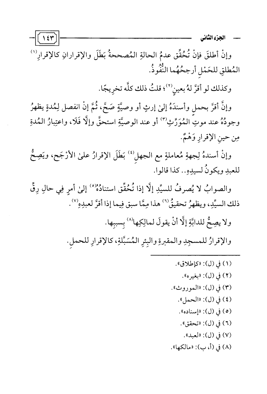 والصوابُ لا يُصرفُ للسيِّدِ إلَّا إذا تُحُقِّق استنادُهُ (¬5) إلى أمرٍ فِي حالِ رِقِّ ذلك السيِّدِ، ويظهرُ تحقيقُ (¬6) هذا مِمَّا سبق فِيما إذا أقرَّ لعبدِهِ (¬7).
