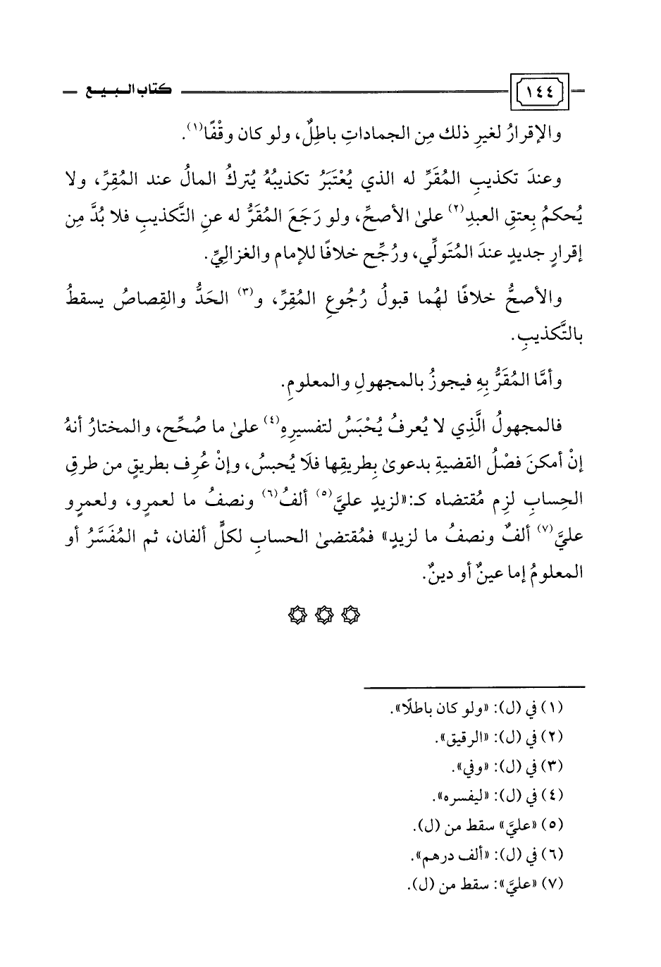 والإقرارُ لغيرِ ذلك مِن الجماداتِ باطِلٌ، ولو كان وقْفًا (¬1).