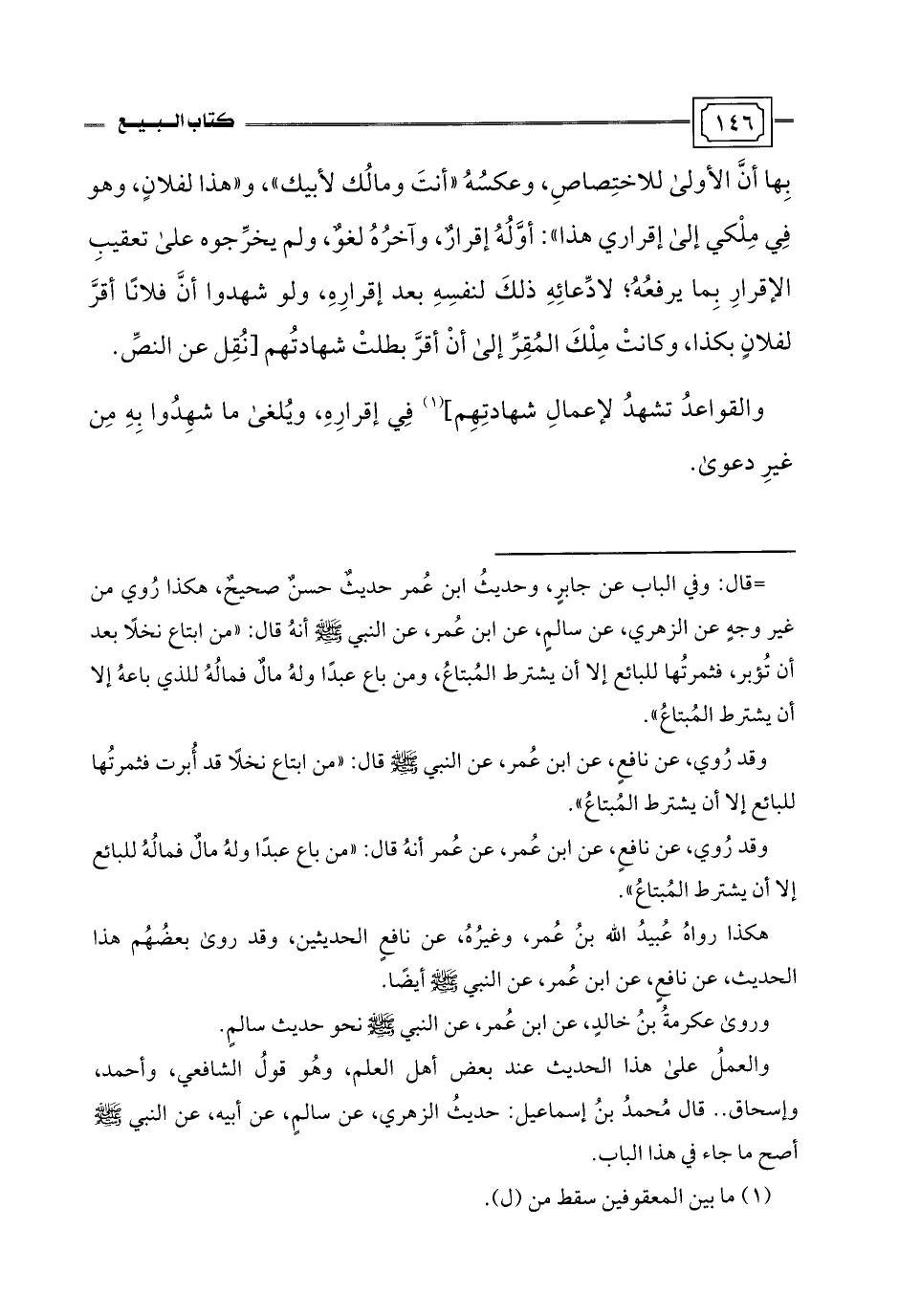 = قال: وفي الباب عن جابرٍ، وحديثُ ابن عُمر حديثٌ حسنٌ صحيحٌ، هكذا رُوي من غير وجهٍ عن الزهري، عن سالمٍ، عن ابن عُمر، عن النبي -صلى اللَّه عليه وسلم- أنهُ قال: "من ابتاع نخلًا بعد أن تُؤبر، فثمرتُها للبائع إلا أن يشترط المُبتاعُ، ومن باع عبدًا ولهُ مالٌ فمالُهُ للذي باعهُ إلا أن يشترط المُبتاعُ".