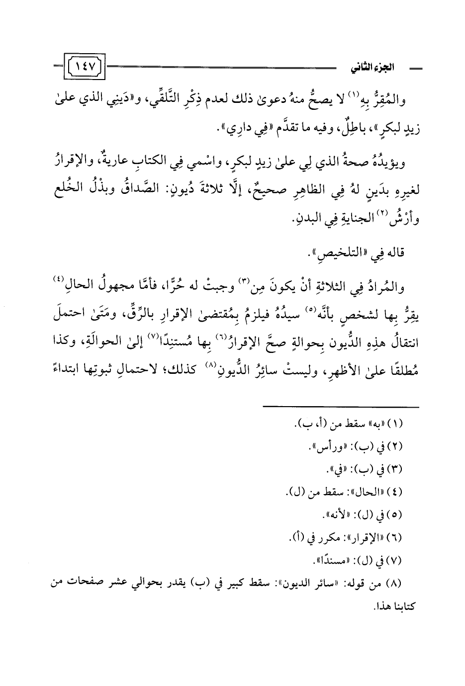 (¬8) من قوله: "سائر الديون": سقط كبير في (ب) يقدر بحوالي عشر صفحات من كتابنا هذا.