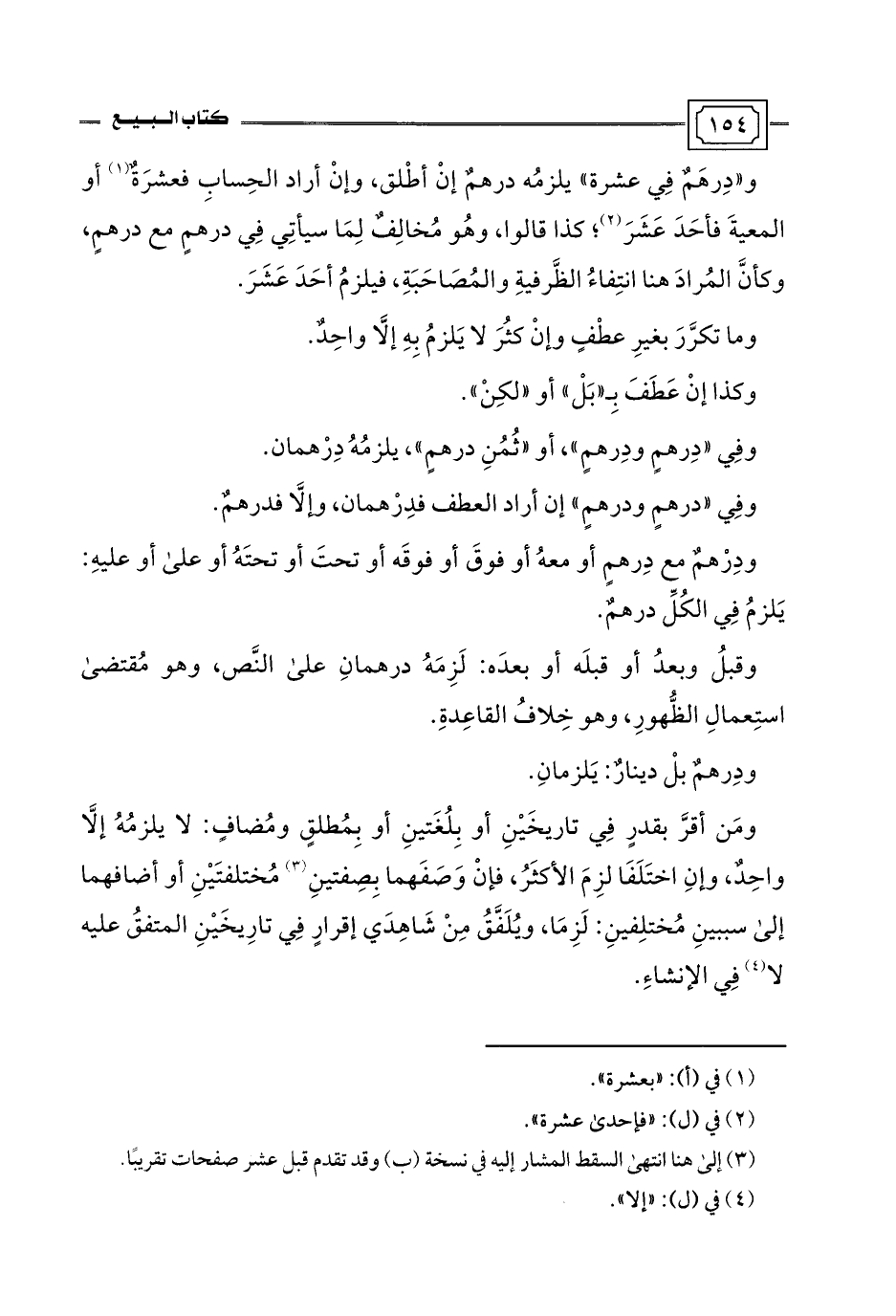 ودِرْهمٌ مع دِرهمٍ أو معهُ أو فوقَ أو فوقَه أو تحتَ أو تحتَهُ أو على أو عليهِ: يَلزمُ فِي الكُلِّ درهمٌ.