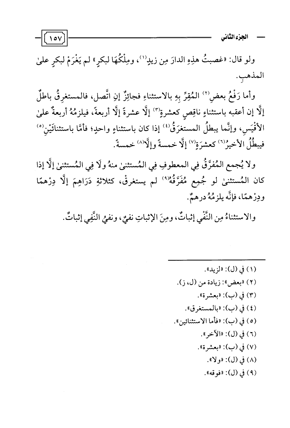 وأما رَفْعُ بعضِ (¬2) المُقِرِّ بِهِ بالاستثناءِ فجائِزٌ إنِ اتَّصل، فالمستغرِقُ باطلٌ إلَّا إن أعقبه باستثناءٍ ناقِصٍ كعشرةٍ (¬3) إلَّا عشرةً إلَّا أربعةً، فيلزمُهُ أربعةٌ على الأقْيَسِ، وإنَّما يبطلُ المستغرَقُ (¬4) إذا كان باستثناءٍ واحدٍ؛ فأمَّا باستثنائَيْنِ (¬5) فيبطُلُ الأخيرُ (¬6) كعشرَةٍ (¬7) إلَّا خمسةً وإلَّا (¬8) خمسةً.