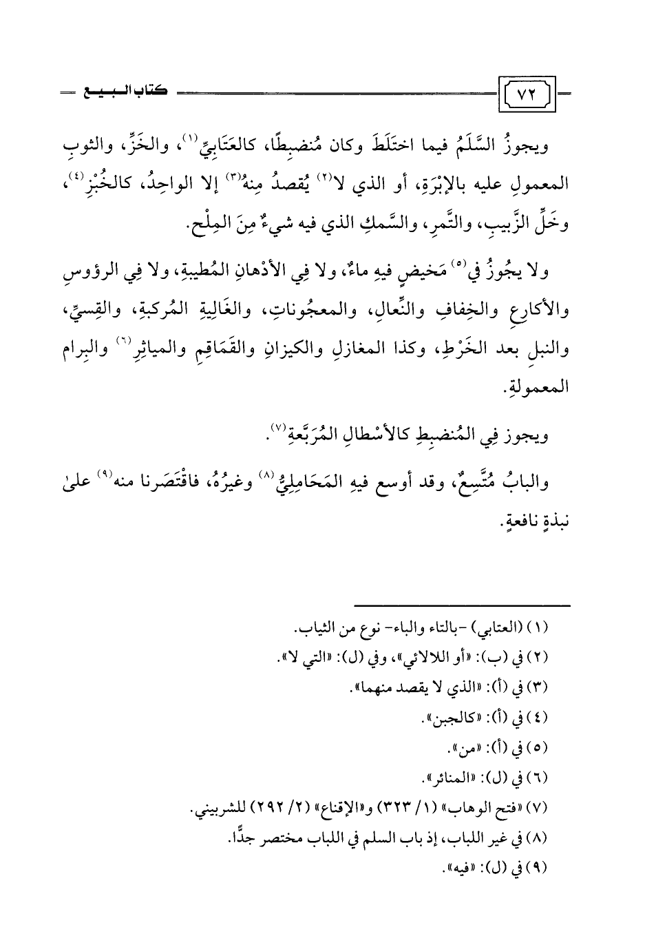 ويجوزُ السَّلَمُ فيما اختَلَطَ وكان مُنضبِطًا، كالعَتَابِيِّ (¬1)، والخَزِّ، والثوبِ المعمولِ عليه بالإبْرَةِ، أو الذي لا (¬2) يُقصدُ مِنهُ (¬3) إلَّا الواحِدُ، كالخُبْزِ (¬4)، وخَلِّ الزَّبيبِ، والتَّمرِ، والسَّمكِ الذي فيه شيءٌ مِنَ المِلْح.
