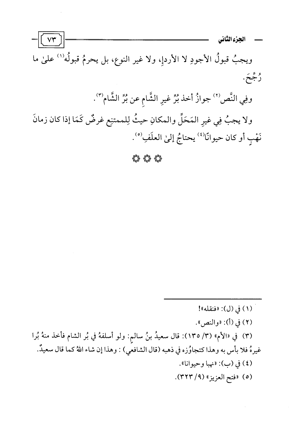 (¬3) في "الأم" (3/ 135): قال سعيدُ بنُ سالمٍ: ولو أسلفهُ في بُر الشام فأخذ منهُ بُرا غيرهُ فلا بأس به وهذا كتجاوُزه في ذهبه (قال الشَّافعي): وهذا إن شاء اللَّهُ كما قال سعيدٌ.