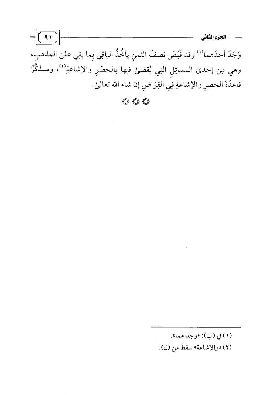 وَجَدَ أحدَهما (¬1) وقد قَبَضَ نصفَ الثمنِ يأخُذُ الباقِي بِما بقِي على المذهبِ، وهي مِن إحدى المسائِلِ التِي يُقضى فيها بالحصْرِ والإشاعةِ (¬2)، وسنذكُرُ قاعدَةَ الحصرِ والإشاعةِ فِي القِرَاضِ إن شاء اللَّه تعالى.