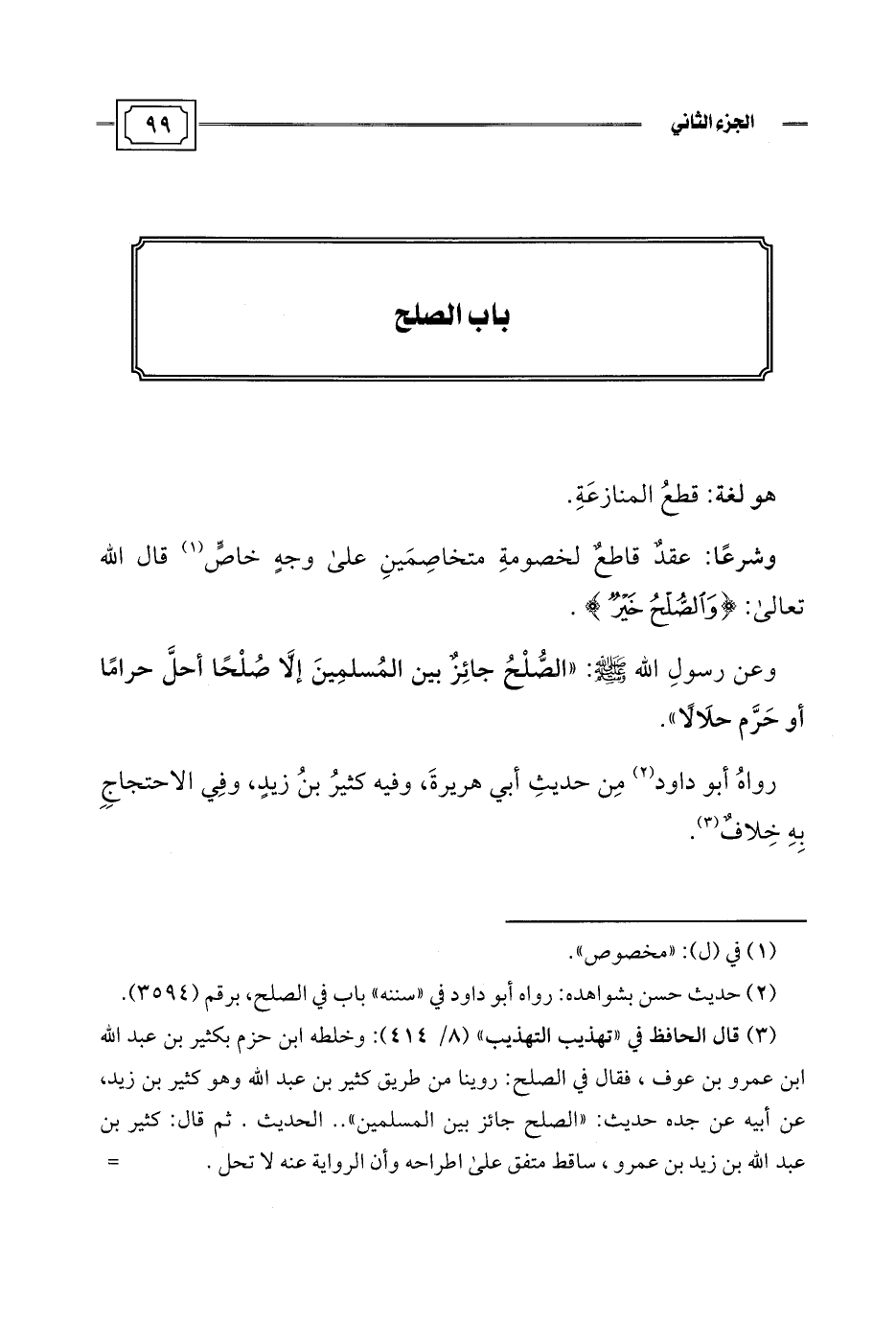 وعن رسولِ اللَّه -صلى اللَّه عليه وسلم-: "الصُّلْحُ جائِز بين المُسلمِينَ إلَّا صُلْحًا أحلَّ حرامًا أو حَرَّم حلَالًا".