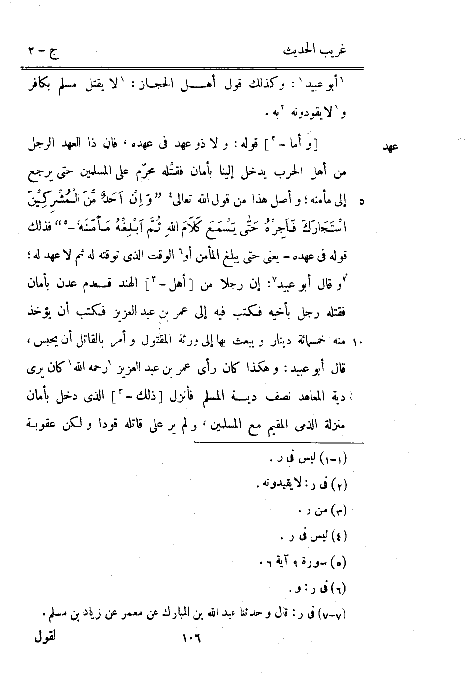 أَبُو عُبَيْدٍ: وَكَذَلِكَ قَول أهل الْحجاز: لَا يقتل مُسلم بِكَافِر ولَا يقودونه بِهِ. [وَأما -] قَوْله: وَلَا ذُو عهد فِي عَهده فَإِن ذَا الْعَهْد الرجل من أهل الْحَرْب يدْخل إِلَيْنَا بِأَمَان فقتْله محرّم على الْمُسلمين حَتَّى يرجع إِلَى مأمنه وأصل هَذَا من قَول اللَّه تَعَالَى {وَإِنْ اَحَدٌ مِّنَ الْمُشْرِكِيْنَ اسْتَجَارَكَ فَاَجِرْهُ حَتَّى يَسْمَعَ كَلاَمَ اللهِ ثُمَّ اَبْلِغْهُ مَأمَنَه} فَذَلِك قَوْله فِي عَهده يَعْنِي حَتَّى يبلغ المأمن أَو الْوَقْت الَّذِي توقته لَهُ ثمَّ لَا عهد لَهُ وَقَالَ أَبُو عبيد: إِن رجلا من [أهل -] الْهِنْد قدم عدن بِأَمَان فَقتله رجل بأَخيه فَكتب فِيهِ إِلَى عمر بْن عبد الْعَزِيز فَكتب أَن يُؤْخَذ مِنْهُ خَمْسمِائَة دِينَار وَيبْعَث بهَا إِلَى وَرَثَة الْمَقْتُول وَأمر بالقاتل أَن يحبس قَالَ أَبُو عُبَيْدٍ: وَهَكَذَا كَانَ رَأْي عمر بْن عبد الْعَزِيز رَحمَه اللَّه كَانَ يرى دِيَة الْمعَاهد نصف دِيَة الْمُسلم فَأنْزل [ذَلِك -] الَّذِي دخل بِأَمَان منزلَة الذِّمِّيّ الْمُقِيم مَعَ الْمُسلمين وَلم ير على قَاتله قودا وَلَكِن عُقُوبَة