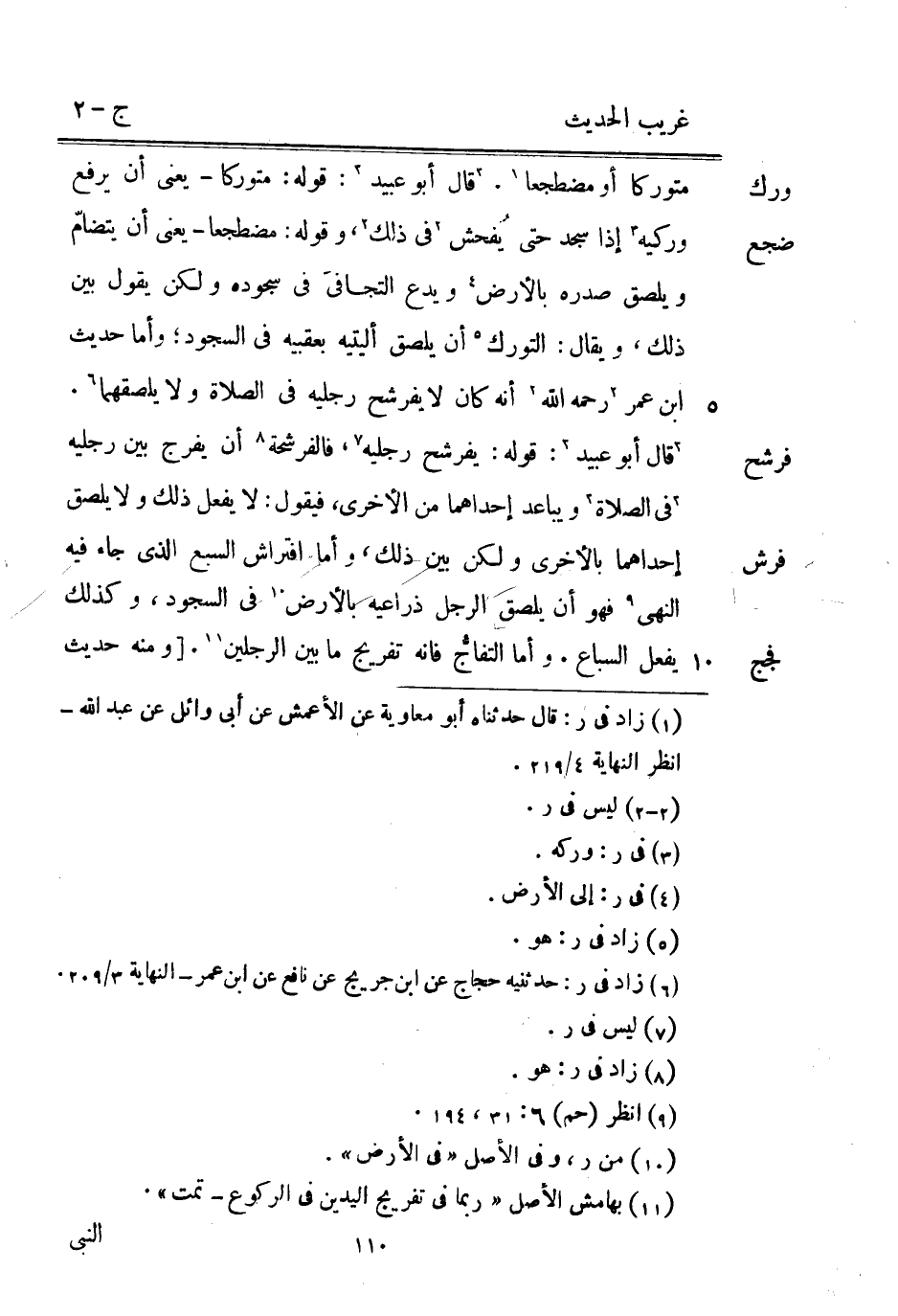 فرشح قَالَ أَبُو عبيد: قَوْله: متوركًا يَعْنِي أَن يرفع وركيه إِذا سجد حَتَّى يُفحش فِي ذَلِك وَقَوله: مُضْطَجعا يَعْنِي أَن يتضامّ ويلصق صَدره بِالْأَرْضِ ويدع التجافيَ فِي سُجُوده وَلَكِن يَقُول بَين ذَلِك وَيُقَال: التورك أَن يلصق أليتيه بعقبيه فِي السُّجُود وَأما حَدِيث ابْن عمر رَحمَه الله أَنه كَانَ لَا يفرشح رجلَيْهِ فِي الصَّلَاة وَلَا يلصقهما.