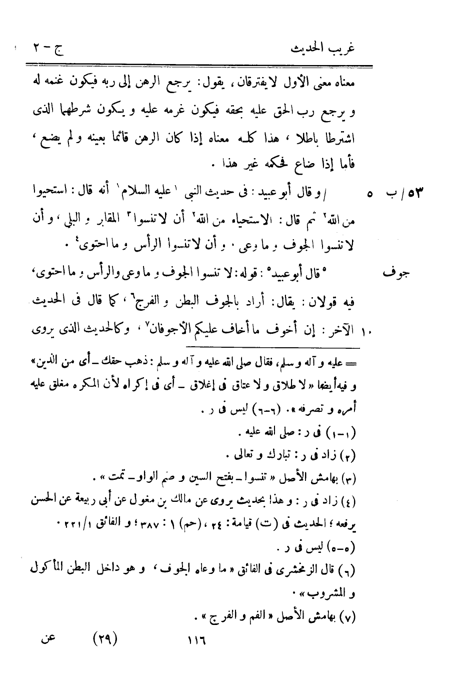 جَوف / وَقَالَ أَبُو عبيد: فِي حَدِيث النَّبِي عَلَيْهِ السَّلَام أَنه قَالَ: اسْتَحْيوا من اللَّه ثمَّ قَالَ: الاستحياء من اللَّه أَن لَا تنسوا الْمَقَابِر والبلي وَأَن لَا تنسوا الْجوف وَمَا وعى وَأَن لَا تنسوا الرَّأْس وَمَا احتوى. قَالَ أَبُو عبيد: قَوْله: لَا تنسوا الْجوف وَمَا وعى وَالرَّأْس وَمَا احتوى فِيهِ قَولَانِ: يُقَال: أَرَادَ بالجوف الْبَطن والفرج كَمَا قَالَ فِي الحَدِيث الآخر: إِن أخوف مَا أَخَاف عَلَيْكُم الأجوفان وكالحديث الَّذِي يرْوى
