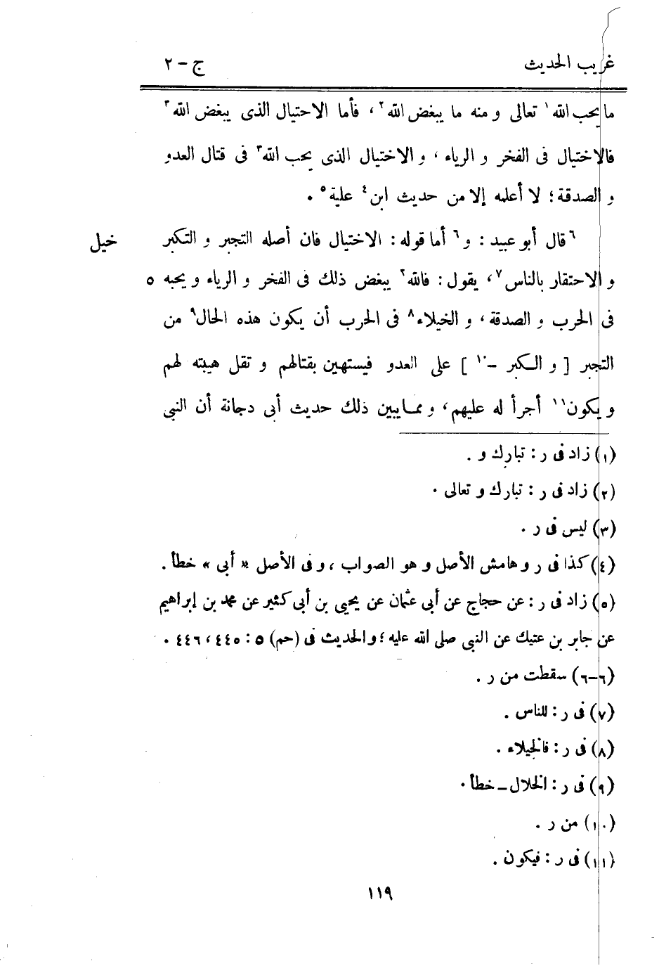 مَا يحب اللَّه تَعَالَى وَمِنْه مَا يبغض اللَّه فَأَما الاختيال الَّذِي يبغض اللَّه فالاختيال فِي الْفَخر والرياء والاختيال الَّذِي يحب اللَّه فِي قتال الْعَدو وَالصَّدَََقَة لَا أعلمهُ إِلَّا من حَدِيث ابْن علية.