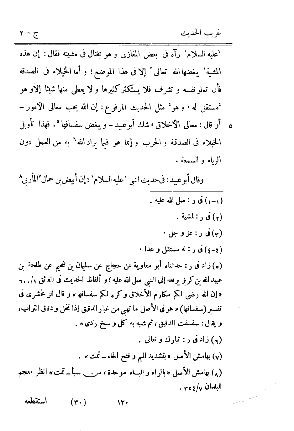 عَلَيْهِ السَّلَام رَآهُ فِي بعض الْمَغَازِي وَهُوَ يختال فِي مشيته فَقَالَ: إِن هَذِه المشية يبغضها اللَّه تَعَالَى إِلَّا فِي هَذَا الْموضع وَأما الْخُيَلَاء فِي الصَّدَقَة فَأن تعلو نَفسه وتشرف فَلَا يستكثر كثيرها وَلَا يُعْطي مِنْهَا شَيْئا إِلَّا وَهُوَ مُسْتَقل لَهُ وَهُوَ مثل الحَدِيث الْمَرْفُوع: إِن اللَّه يحب معالي الْأُمُور أَو قَالَ: معالي الْأَخْلَاق شكّ أَبُو عبيد وَيبغض سفسافها. فَهَذَا تَأْوِيل الْخُيَلَاء فِي الصَّدَقَة وَالْحَرب وَإِنَّمَا هُوَ فِيمَا يُرَاد اللَّه بِهِ من الْعَمَل دون الرِّيَاء والسمعة. وَقَالَ أَبُو عبيد: فِي حَدِيث النَّبِي عَلَيْهِ السَّلَام: إِن أَبيض بن حمال المأربي
