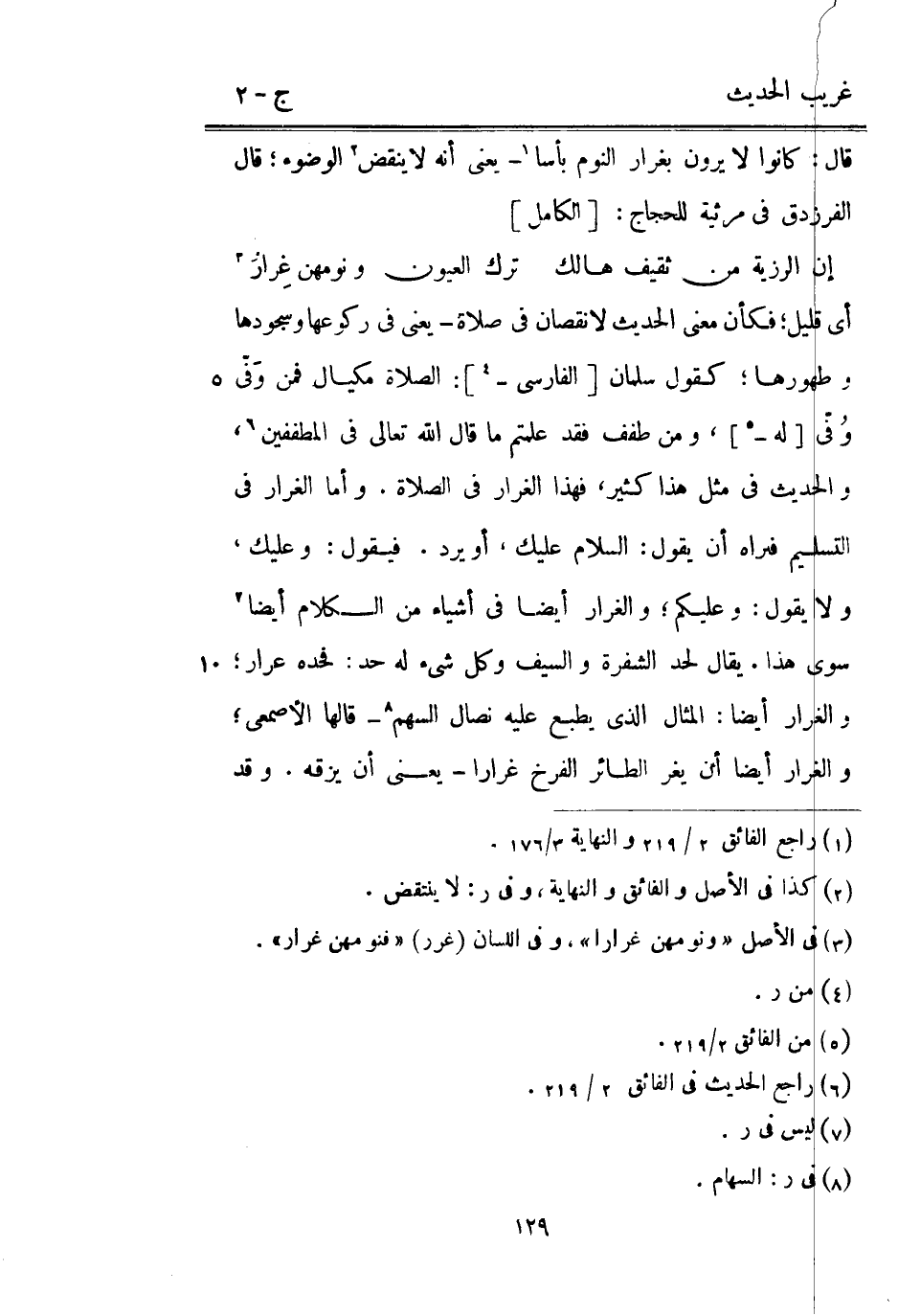 أَي قَلِيل فَكَأَن معنى الحَدِيث لَا نُقْصَان فِي صَلَاة يَعْنِي فِي ركوعها وسجودها وطهورها كَقَوْل سلمَان [الْفَارِسِي -] : الصَّلَاة مكيال فَمن وَفّي وُفي [لَهُ -] وَمن طفف فقد علمْتُم مَا قَالَ اللَّه تَعَالَى فِي المطففين والْحَدِيث فِي مثل هَذَا كثير فَهَذَا الغرار فِي الصَّلَاة. وَأما الغرار فِي التَّسْلِيم فنراه أَن يَقُول: السَّلَام عَلَيْك أَو يرد. فَيَقُول: وَعَلَيْك وَلَا يَقُول: وَعَلَيْكُم والغرار أَيْضا فِي أَشْيَاء من الْكَلَام أَيْضا سوى هَذَا. يُقَال لحد الشَّفْرَة وَالسيف وكل شَيْء لَهُ حد: فحده عرار والغرار أَيْضا: الْمِثَال الَّذِي يطبع عَلَيْهِ نصال السهْم قَالَهَا الْأَصْمَعِي والغرار أَيْضا أَن يغر الطَّائِر الفرخ غرارا يَعْنِي أَن يزقه. وَقد