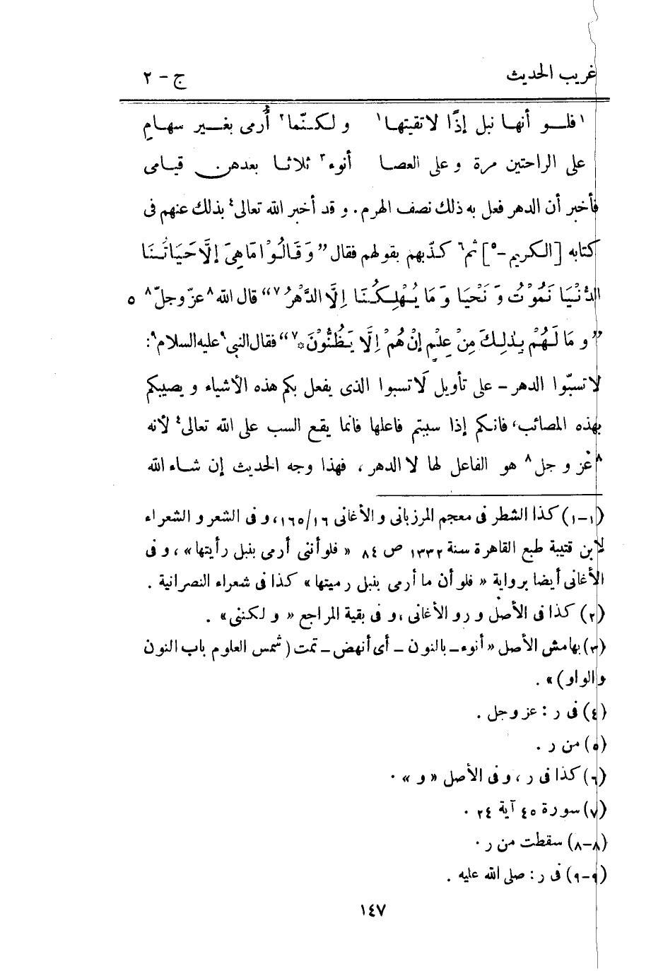 فَأخْبر أَن الدَّهْر فعل بِهِ ذَلِك نصف الْهَرم. وَقد أخبر اللَّه تَعَالَى بذلك عَنْهُم فِي كِتَابه [الْكَرِيم -] ثمَّ كذّبهم بقَوْلهمْ فَقَالَ {وَقَالُوْا مَا هِيَ إلاَ حَيَاتُنَا الدُنْيَا نَمُوْتُ وَنْحَيا وَمَا يُهْلِكُنَا إلاَّ الدَّهْرُ} قَالَ اللَّه عز وَجل {ومَا لَهُمْ بِذلِكَ مِنْ عِلْمٍ إنْ هُمْ إِلاَّ يَظُنُّوْنَ} فَقَالَ النَّبِي عَلَيْهِ السَّلَام: لَا تسبّوا الدَّهْر على تَأْوِيل لَا تسبوا الَّذِي يفعل بكم هَذِه الْأَشْيَاء ويصيبكم بِهَذِهِ المصائب فَإِنَّكُم إِذا سببتم فاعلها فَإِنَّمَا يَقع السب على اللَّه تَعَالَى لِأَنَّهُ عز وَجل هُوَ الْفَاعِل لَهَا لَا الدَّهْر فَهَذَا وَجه الحَدِيث إِن شَاءَ الله
