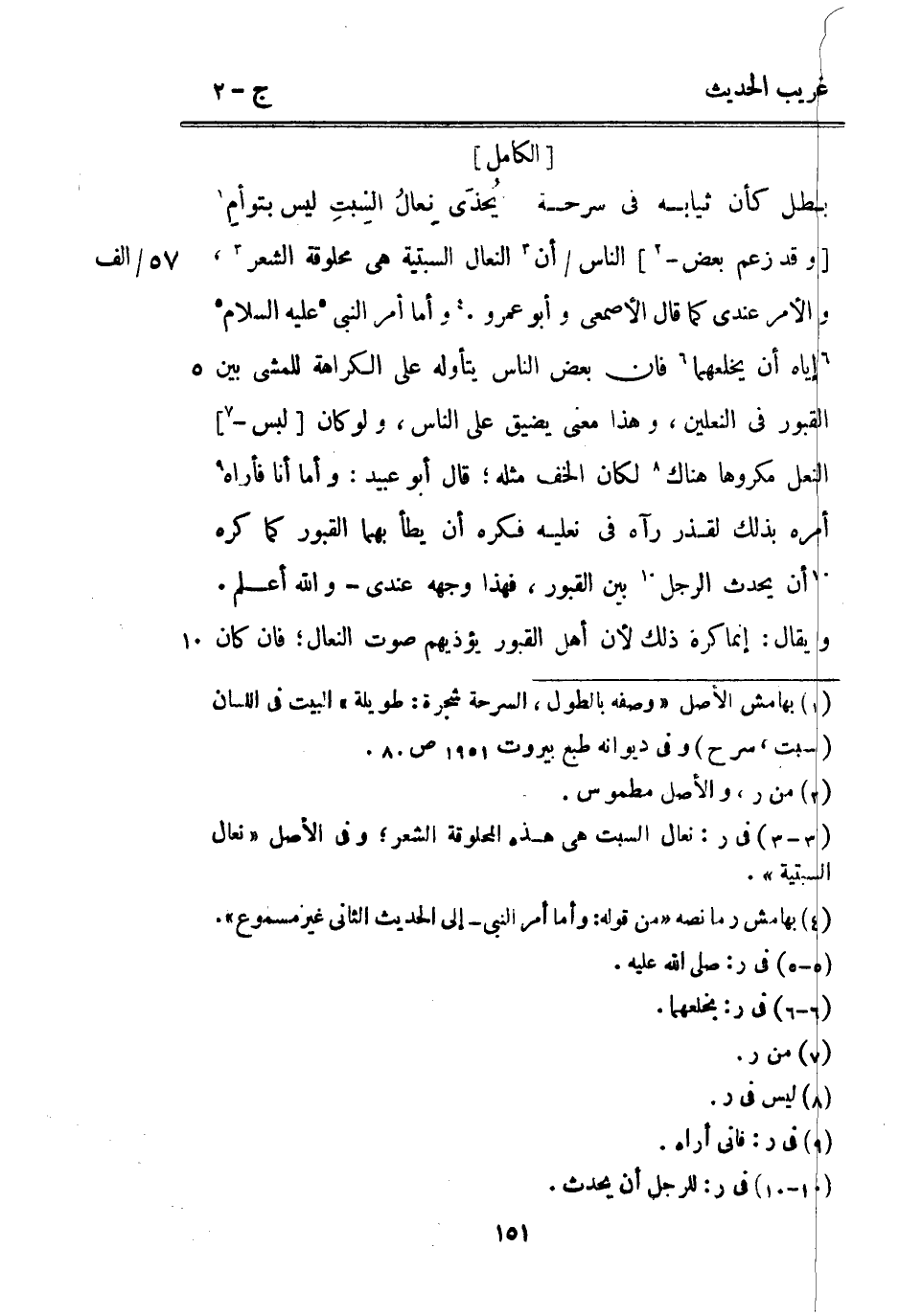 بَطل كَأَن ثِيَابه فِي سرحة ... يُحذَى نِعالُ السِبتِ لَيْس بتوأمِ ... [وَقد زعم بعض -] النَّاس / أَن النِّعَال السبتية هِيَ محلوقة الشّعْر 57 / الف وَالْأَمر عِنْدِي كَمَا قَالَ الْأَصْمَعِي وَأَبُو عَمْرو. وَأما أَمر النَّبِي عَلَيْهِ السَّلَام إِيَّاه أَن يخلعهما فَإِن بعض النَّاس يتأوله على الْكَرَاهَة للمشي بَين الْقُبُور فِي النَّعْلَيْنِ وَهَذَا معنى يضيق على النَّاس وَلَو كَانَ [لبس -] النَّعْل مَكْرُوها هُنَاكَ لَكَانَ الْخُف مثله قَالَ أَبُو عُبَيْدٍ: وَأما أَنا فَأرَاهُ أمره بذلك لقذر رَآهُ فِي نَعْلَيْه فكره أَن يطَأ بهما الْقُبُور كَمَا كره أَن يحدث الرجل بَين الْقُبُور فَهَذَا وَجهه عِنْدِي وَالله أعلم. وَيُقَال: إِنَّمَا كره ذَلِك لِأَن أهل الْقُبُور يؤذيهم صَوت النِّعَال فَإِن كَانَ