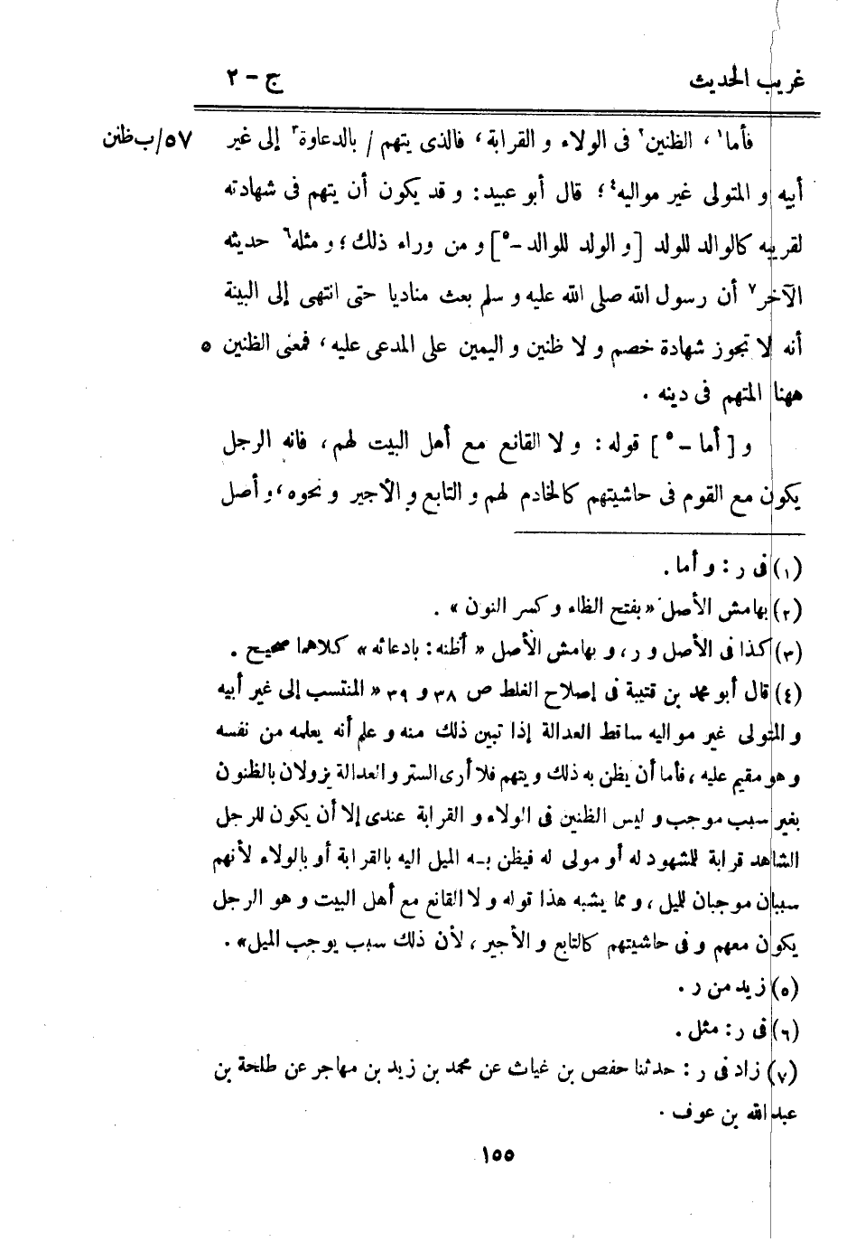 فَأَما الظنين فِي الْوَلَاء والقرابة فَالَّذِي يتهم / بالدعاوة إِلَى غير 57 / ب أَبِيه وَالْمُتوَلِّيّ غير موَالِيه قَالَ أَبُو عُبَيْدٍ: وَقد يكون أَن يتهم فِي شَهَادَته لقريبه كالوالد للْوَلَد [وَالْولد للوالد -] وَمن وَرَاء ذَلِك وَمثله حَدِيثه الآخر إِن رَسُول اللَّه صلي اللَّه عَلَيْهِ وَسلم بعث مناديا حَتَّى انْتهى إِلَى الْبَيِّنَة أَنه لَا تجوز شَهَادَة خصم وَلَا ظنين وَالْيَمِين على الْمُدَّعِي عَلَيْهِ فَمَعْنَى الظنين هَهُنَا الْمُتَّهم فِي دينه. و [أما -] قَوْله: لَا القانع مَعَ أهل الْبَيْت لَهُم فَإِنَّهُ الرجل يكون مَعَ الْقَوْم فِي حاشيتهم كالخادم لَهُم وَالتَّابِع والأجير وَنَحْوه وأصل