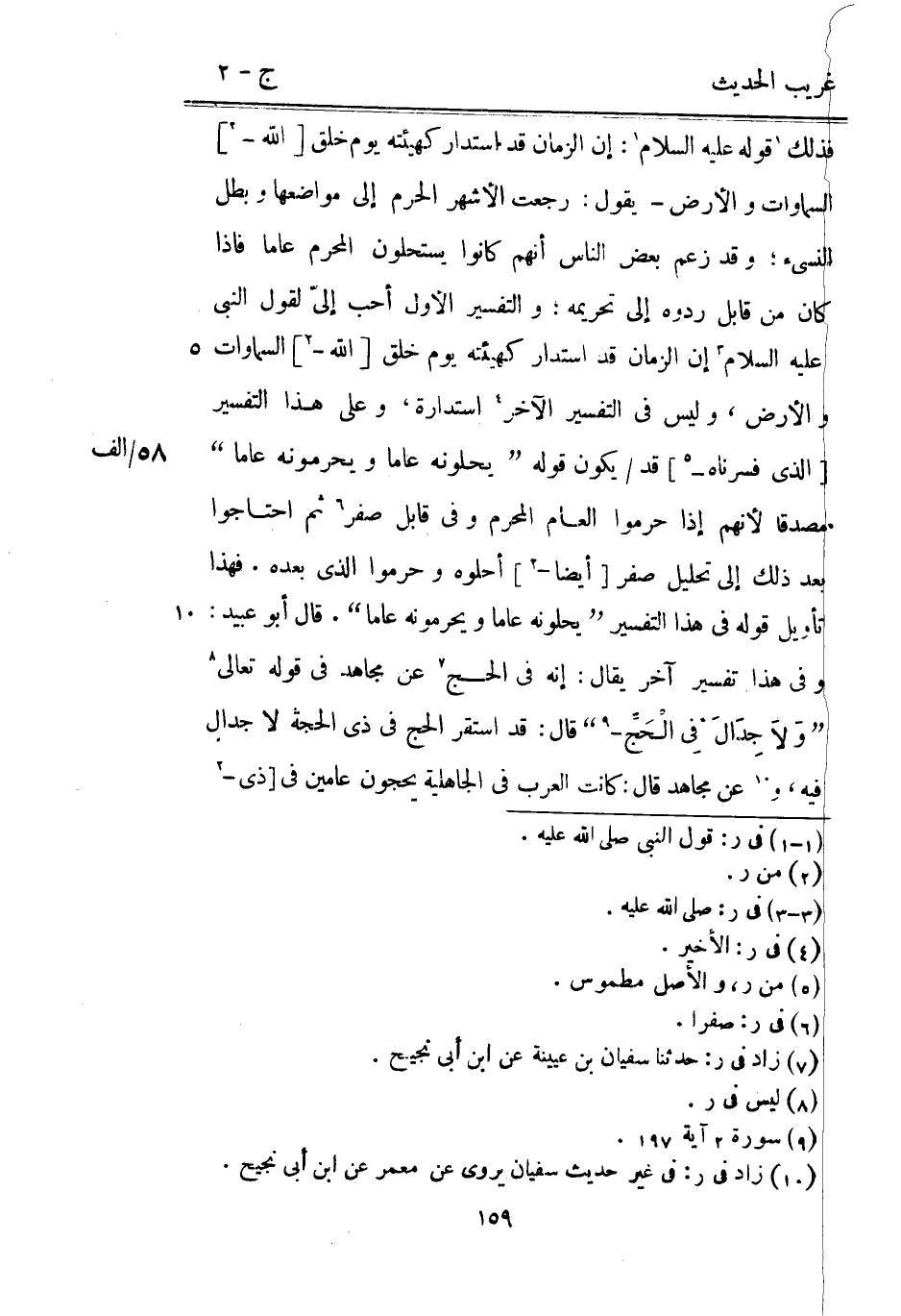 فَذَلِك قَوْله عَلَيْهِ السَّلَام: إِن الزَّمَان قد اسْتَدَارَ كَهَيْئَته يَوْم خلق [اللَّه -] السَّمَاوَات وَالْأَرْض يَقُول: رجعت الْأَشْهر الْحرم إِلَى موَاضعهَا وَبَطل النسيء وَقد زعم بعض النَّاس أَنهم كَانُوا يسْتَحلُّونَ الْمحرم عَاما فَإِذا كَانَ من قَابل ردُّوهُ إِلَى تَحْرِيمه وَالتَّفْسِير الأول أحب إليّ لقَوْل النَّبِي عَلَيْهِ السَّلَام إِن الزَّمَان قد اسْتَدَارَ كَهَيْئَته يَوْم خلق [اللَّه -] السَّمَاوَات وَالْأَرْض وَلَيْسَ فِي التَّفْسِير الآخر استدارة وعَلى هَذَا التَّفْسِير [الَّذِي فسرناه -] قد / يكون قَوْله {يُحِلُّونَهُ عَامًا ويحرمونه عَاما} 58 / الف مُصدقا لأَنهم إِذا حرمُوا الْعَام الْمحرم وَفِي قَابل صفر ثمَّ احتاجوا بعد ذَلِك إِلَى تَحْلِيل صفر [أَيْضا -] أحلوه وحرموا الَّذِي بعده. فَهَذَا تَأْوِيل قَوْله فِي هَذَا التَّفْسِير {يُحِلُّونَهُ عَامًا وَيُحَرِّمُونَهُ عَاما} . قَالَ أَبُو عُبَيْد: وَفِي هَذَا تَفْسِير آخر يُقَال: إِنَّه فِي الْحَج عَن مُجَاهِد فِي قَوْله تَعَالَى {وَلاَ جِدَالَ فِي الْحَجَّ} قَالَ: قد اسْتَقر الْحَج فِي ذِي الْحجَّة لَا جِدَال فِيهِ وعَن مُجَاهِد قَالَ: كَانَت الْعَرَب فِي الْجَاهِلِيَّة يحجون عَاميْنِ فِي [ذِي -