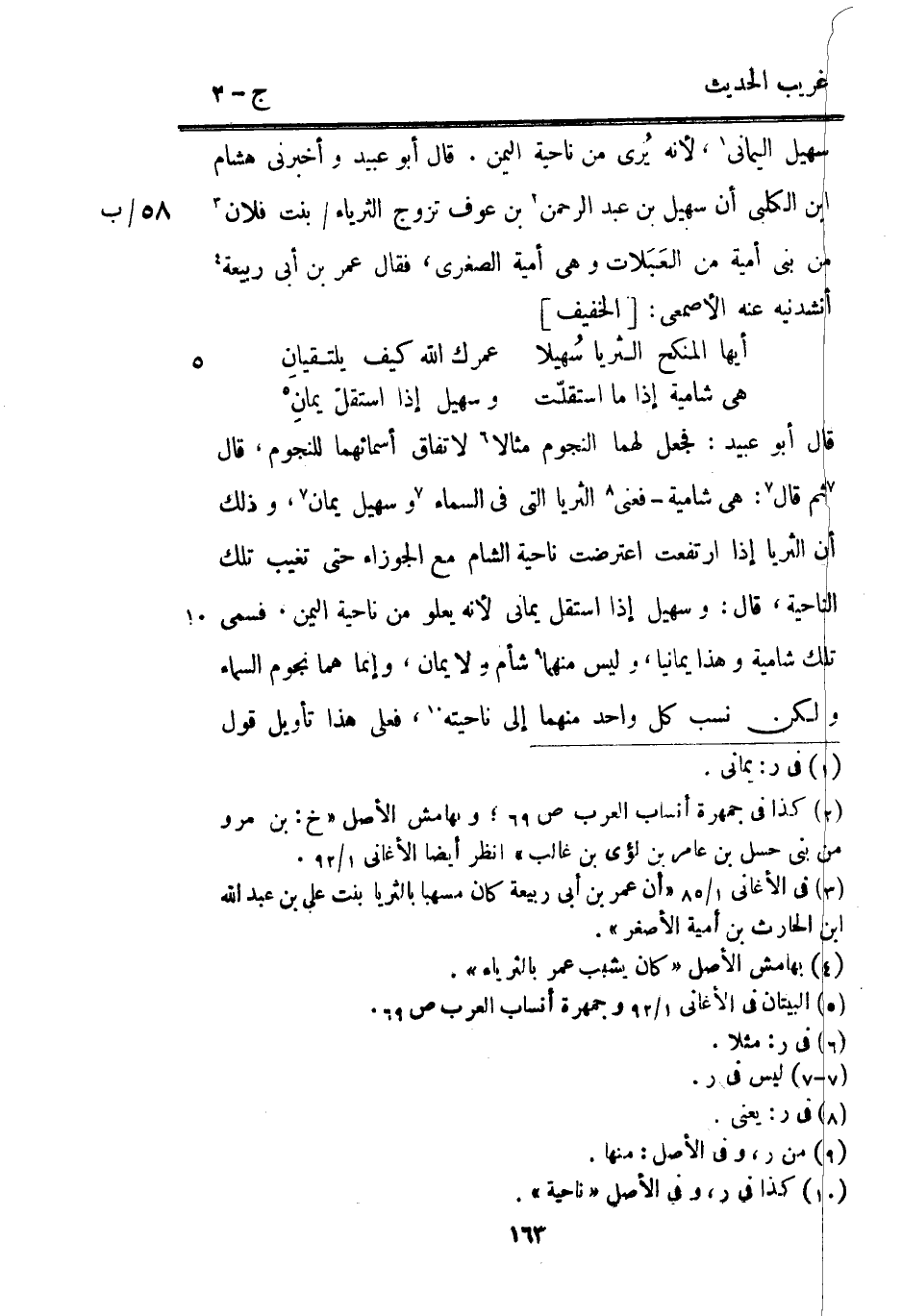 قَالَ أَبُو عبيد: فَجعل لَهما النُّجُوم مِثَالا لِاتِّفَاق أسمائهما للنجوم قَالَ ثمَّ قَالَ: هِيَ شامية فعنى الثريا الَّتِي فِي السَّمَاء وَسُهيْل يمَان وَذَلِكَ أَن الثريا إِذا ارْتَفَعت اعترضت نَاحيَة الشَّام مَعَ الجوزاء حَتَّى تغيب تِلْكَ النَّاحِيَة قَالَ: وَسُهيْل إِذا اسْتَقل يماني لِأَنَّهُ يَعْلُو من نَاحيَة الْيمن. فَسمى تِلْكَ شامية وَهَذَا يَمَانِيا وَلَيْسَ مِنْهُمَا شأم وَلَا يمَان وَإِنَّمَا هما نُجُوم السَّمَاء وَلَكِن نسب كل وَاحِد مِنْهُمَا إِلَى ناحيته فعلى هَذَا تَأْوِيل قَول