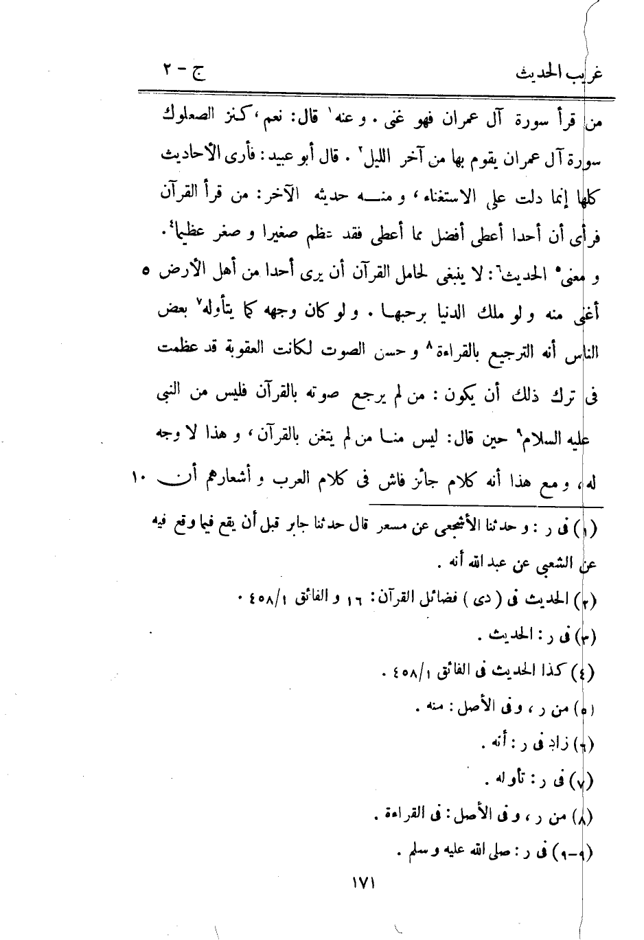 مثل قَالَ أَبُو عبيد: فَأرى الْأَحَادِيث كلهَا إِنَّمَا دلّت على الِاسْتِغْنَاء وَمِنْه حَدِيثه الآخر: من قَرَأَ الْقُرْآن فَرَأى أَن أحدا أعْطى أفضل مِمَّا أعْطى فقد عظم صَغِيرا وَصغر عَظِيما. وَمعنى الحَدِيث: لَا يَنْبَغِي لحامل الْقُرْآن أَن يرى أحدا من أهل الأَرْض أغْنى مِنْهُ وَلَو ملك الدُّنْيَا برحبها. وَلَو كَانَ وَجهه كَمَا يتأوله بعض النَّاس أَنه الترجيع بِالْقِرَاءَةِ وَحسن الصَّوْت لكَانَتْ الْعقُوبَة قد عظمت فِي ترك ذَلِك أَن يكون: من لم يرجع صَوته بِالْقُرْآنِ فَلَيْسَ من النَّبِي عَلَيْهِ السَّلَام حِين قَالَ: لَيْسَ منا من لم يَتَغَنَّ بِالْقُرْآنِ وَهَذَا لَا وَجه لَهُ وَمَعَ هَذَا أَنه كَلَام جَائِز فَاش فِي كَلَام الْعَرَب وأشعارهم أَن