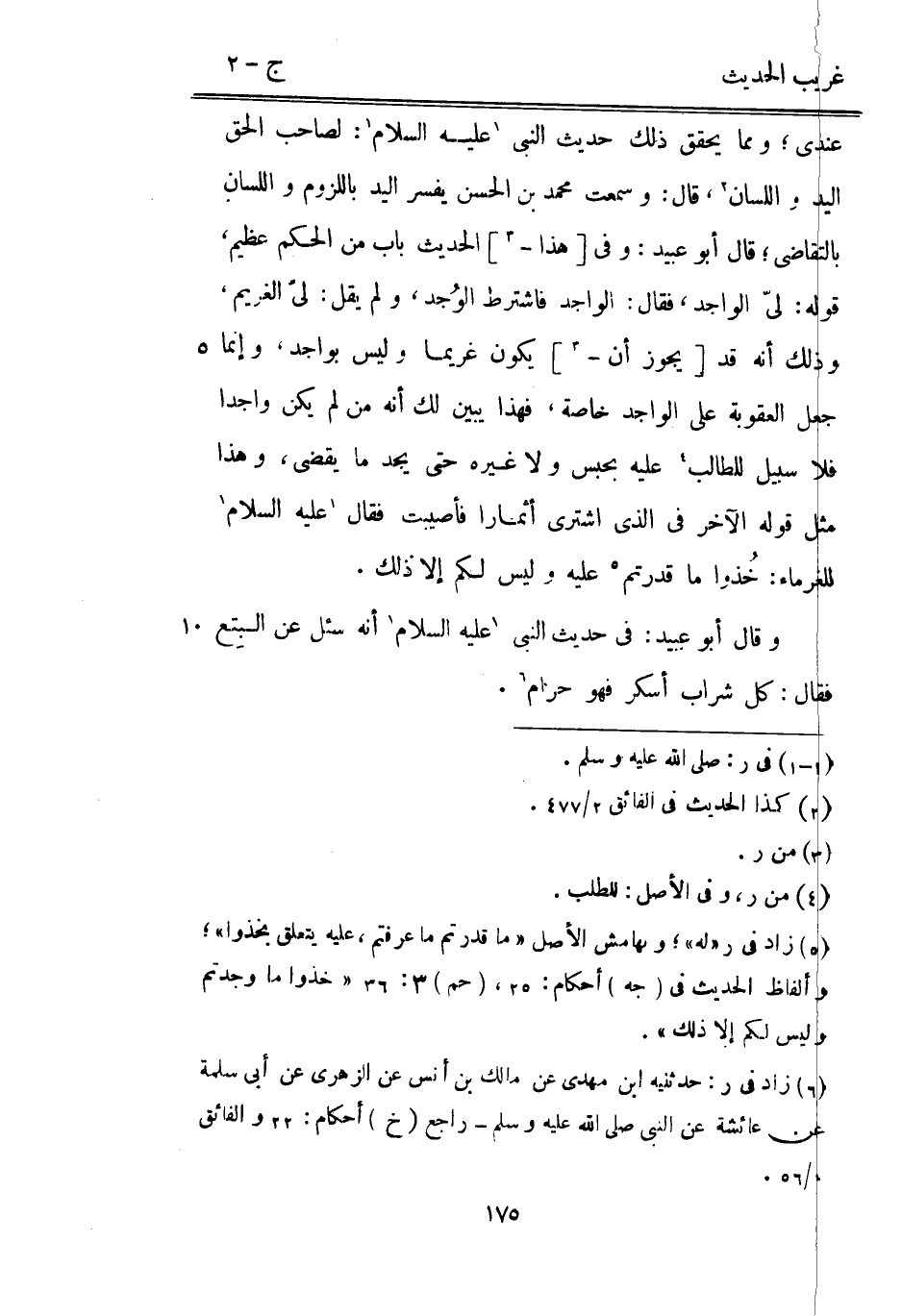 عِنْدِي وَمِمَّا يُحَقّق ذَلِك حَدِيث النَّبِي عَلَيْهِ السَّلَام: لصَاحب الْحق الْيَد وَاللِّسَان قَالَ: وَسمعت مُحَمَّد بْن الْحسن يُفَسر الْيَد باللزوم وَاللِّسَان بالتقاضي قَالَ أَبُو عُبَيْد: وَفِي [هَذَا -] الحَدِيث بَاب من الحكم عَظِيم قَوْله: لَيّ الْوَاجِد فَقَالَ: الْوَاجِد فَاشْترط الوُجد وَلم يقل: ليّ الْغَرِيم وَذَلِكَ أَنه قد [يجوز أَن -] يكون غريما وَلَيْسَ بواجد وَإِنَّمَا جعل الْعقُوبَة على الْوَاجِد خَاصَّة فَهَذَا يبين لَك أَنه من لم يكن واجدا فَلَا سَبِيل للطَّالِب عَلَيْهِ بِحَبْس وَلَا غَيره حَتَّى يجد مَا يقْضِي وَهَذَا مثل قَوْله الآخر فِي الَّذِي اشْترى أثمارا فأصيبت فَقَالَ عَلَيْهِ السَّلَام للْغُرَمَاء: خُذوا مَا قدرتم عَلَيْهِ وَلَيْسَ لكم إِلَّا ذَلِك. وَقَالَ أَبُو عبيد: فِي حَدِيث النَّبِيّ عَلَيْهِ السَّلَام أَنه سُئِلَ عَن البِتع فَقَالَ: كل شراب أسكر فَهُوَ حرَام.