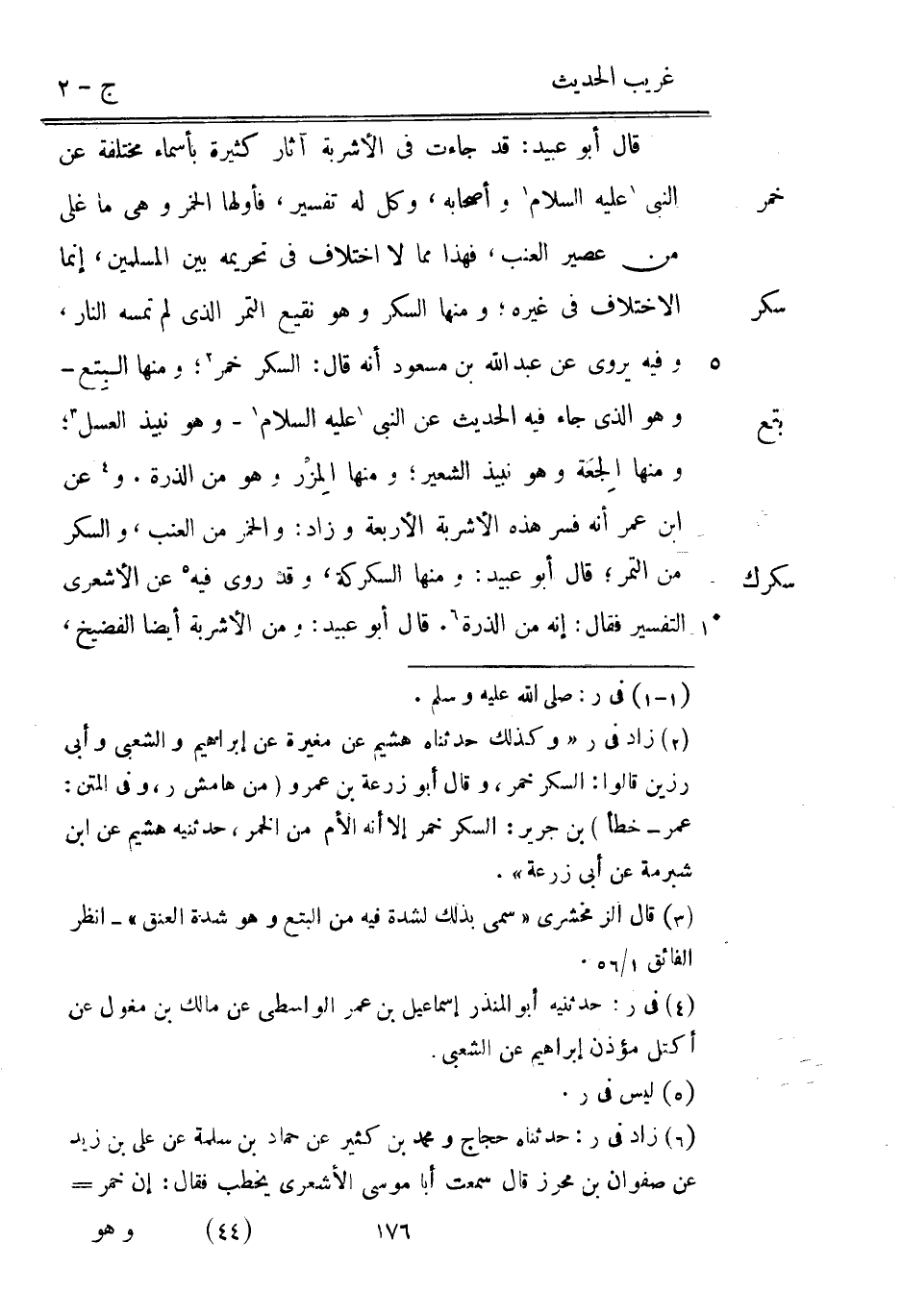 خمر سكر بتع سكرك قَالَ أَبُو عبيد: قد جَاءَت فِي الْأَشْرِبَة آثَار كَثِيرَة بأسماء مُخْتَلفَة عَن النَّبِي عَلَيْهِ السَّلَام وَأَصْحَابه وكل لَهُ تَفْسِير فأولها الْخمر وَهِي مَا غلى من عصير الْعِنَب فَهَذَا مِمَّا لَا اخْتِلَاف فِي تَحْرِيمه بَين الْمُسلمين إِنَّمَا الِاخْتِلَاف فِي غَيره وَمِنْهَا السكر وَهُوَ نَقِيع التَّمْر الَّذِي لم تمسه النَّار وَفِيه يرْوى عَن عَبْد اللَّه بْن مَسْعُود أَنه قَالَ: السكر خمر وَمنا البِتع وَهُوَ الَّذِي جَاءَ فِيهِ الحَدِيث عَن النَّبِي عَلَيْهِ السَّلَام وَهُوَ نَبِيذ الْعَسَل وَمِنْهَا الجِعة وَهُوَ نَبِيذ الشّعير وَمِنْهَا المِزْر وَهُوَ من الذّرة وعَن ابْن عمر أَنه فسر هَذِه الْأَشْرِبَة الْأَرْبَعَة وَزَاد: وَالْخمر من الْعِنَب وَالسكر من التَّمْر قَالَ أَبُو عُبَيْدٍ: وَمِنْهَا السكركة وَقد رُوِيَ فِيهِ عَن الْأَشْعَرِيّ التَّفْسِير فَقَالَ: إِنَّه من الذّرة.