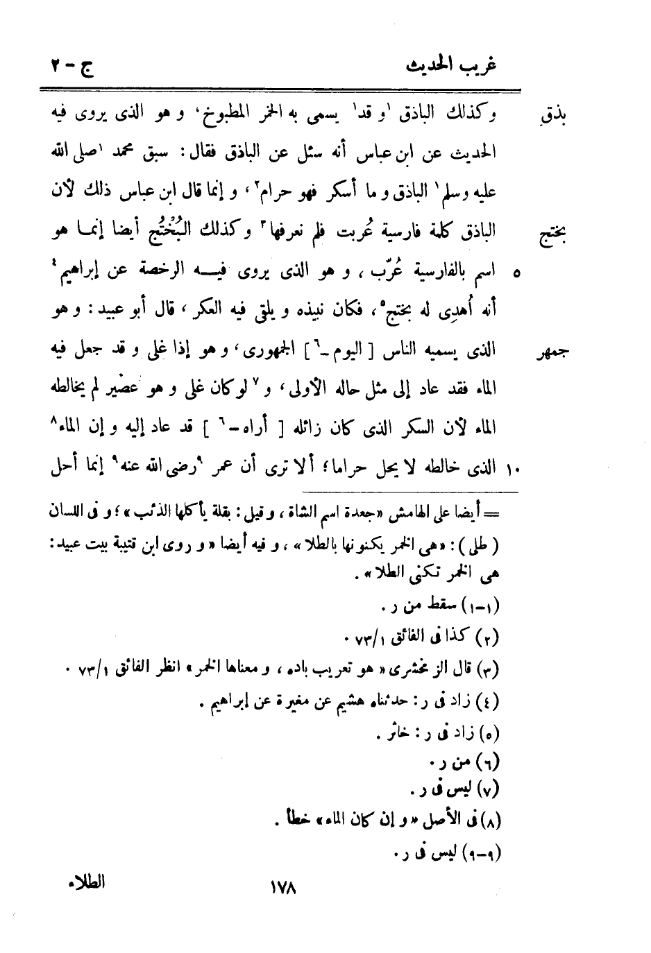 وَكَذَلِكَ الباذق وَقد يُسمى بِهِ الْخمر الْمَطْبُوخ وَهُوَ الَّذِي يرْوى فِيهِ الحَدِيث عَن ابْن عَبَّاس أَنه سُئِلَ عَن الباذق فَقَالَ: سبق مُحَمَّد صلى الله عَلَيْهِ وَسلم الباذق وَمَا أسكر فَهُوَ حرَام وَإِنَّمَا قَالَ ابْن عَبَّاس ذَلِك لِأَن الباذق كلمة فارسية عُربت فَلم نعرفها وَكَذَلِكَ البُخْتُج أَيْضا إِنَّمَا هُوَ اسْم بِالْفَارِسِيَّةِ عُرّب وَهُوَ الَّذِي يرْوى فِيهِ الرُّخْصَة عَن إِبْرَاهِيم أَنه أُهدى لَهُ بختج فَكَانَ نبيذه ويلقى فِيهِ العكر