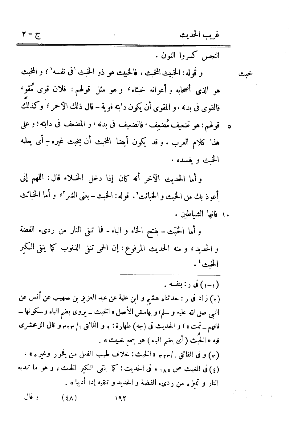 النَّجس كسروا النُّون. وَقَوله: الْخَبيث المخبث فالخبيث هُوَ ذُو الْخبث فِي نَفسه والمخبث هُوَ الَّذِي أَصْحَابه وأعوانه خبثاء وَهُوَ مثل قَوْلهم: فلَان قوي مُقوٍ فالقوي فِي بدنه والمقوي أَن يكون دَابَّته قَوِيَّة - قَالَ ذَلِك الْأَحْمَر وَكَذَلِكَ قَوْلهم: هُوَ ضَعيف مُضعِف فالضعيف فِي بدنه والمضعف فِي دَابَّته وعَلى هَذَا كَلَام الْعَرَب. وَقد يكون أَيْضا المخبث أَن يخْبث غَيره - أَي يُعلمهُ الْخبث ويفسده. وأماالحديث الآخر أَنه كَانَ إِذا دخل الْخَلَاء قَالَ: اللَّهُمَّ إِنِّي أعوذ بك من الْخبث والخبائث. قَوْله: الْخبث - يَعْنِي الشَّرّ وَأما الْخَبَائِث فَإِنَّهَا الشَّيَاطِين. وَأما الخَبث - بِفَتْح الْخَاء وَالْبَاء - فَمَا تَنْفِي النَّار من رَدِيء الْفضة وَالْحَدِيد وَمِنْه الحَدِيث الْمَرْفُوع: إِن الْحمى تَنْفِي الذُّنُوب كَمَا يَنْفِي الْكبر الْخبث.