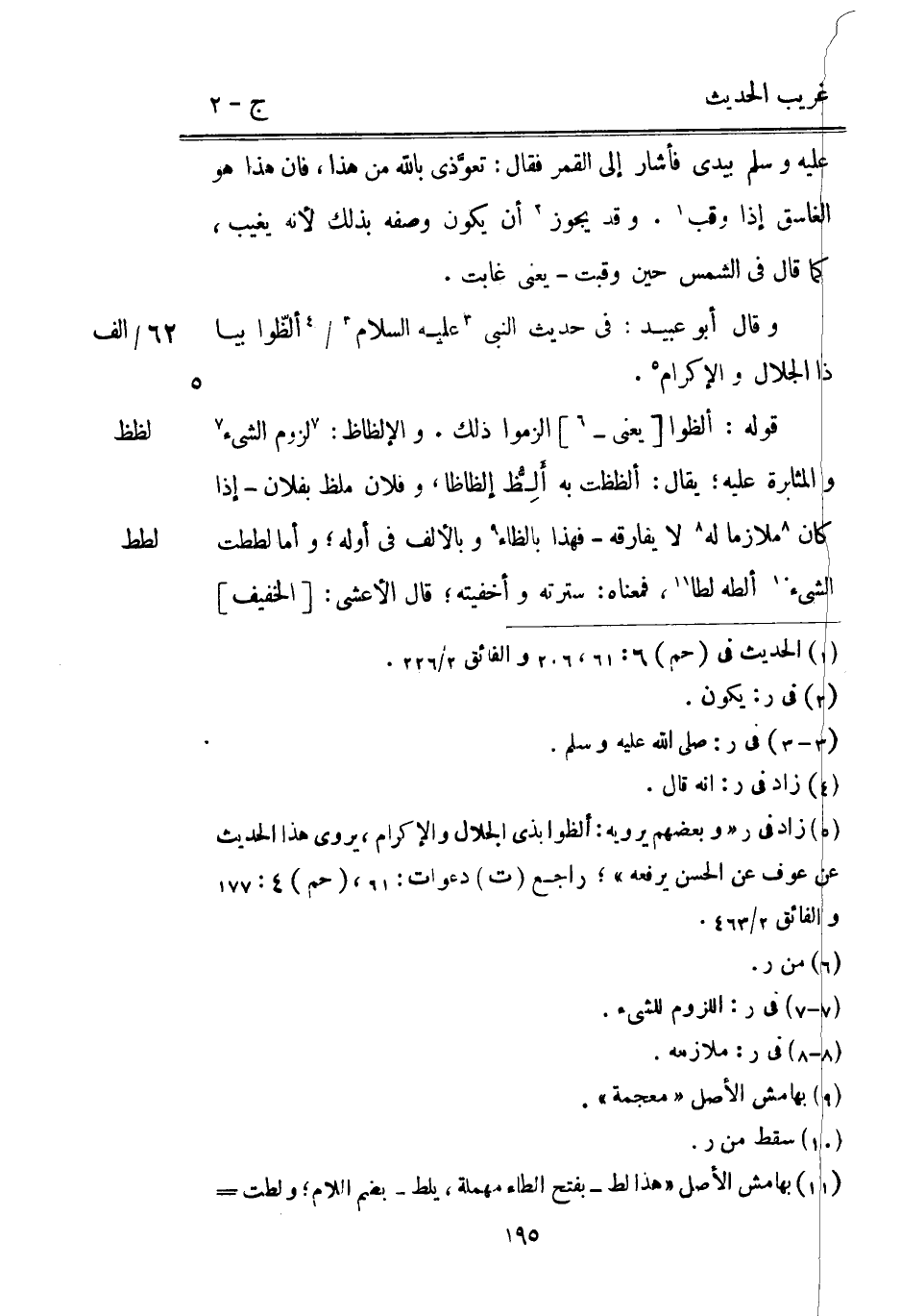 لظظ لطط وَقَالَ أَبُو عبيد: فِي حَدِيث النَّبِي عَلَيْهِ السَّلَام / ألظوابيا 62 / الف ذَا الْجلَال وَالْإِكْرَام. قَوْله: أَلظُّوا [يَعْنِي -] الزموا ذَلِك. والألفاظ: لُزُوم الشَّيْء والمثابرة عَلَيْهِ يُقَال: ألظظت بِهِ ألِظُّ إلظاظا وَفُلَان ملظ بفلان - إِذا كَانَ ملازما لَهُ لَا يُفَارِقهُ - فَهَذَا بالظاء وبالألف فِي أَوله وَأما لططت الشَّيْء ألطه لطا فَمَعْنَاه: سترته وأخفيته قَالَ الْأَعْشَى [الْخَفِيف]
