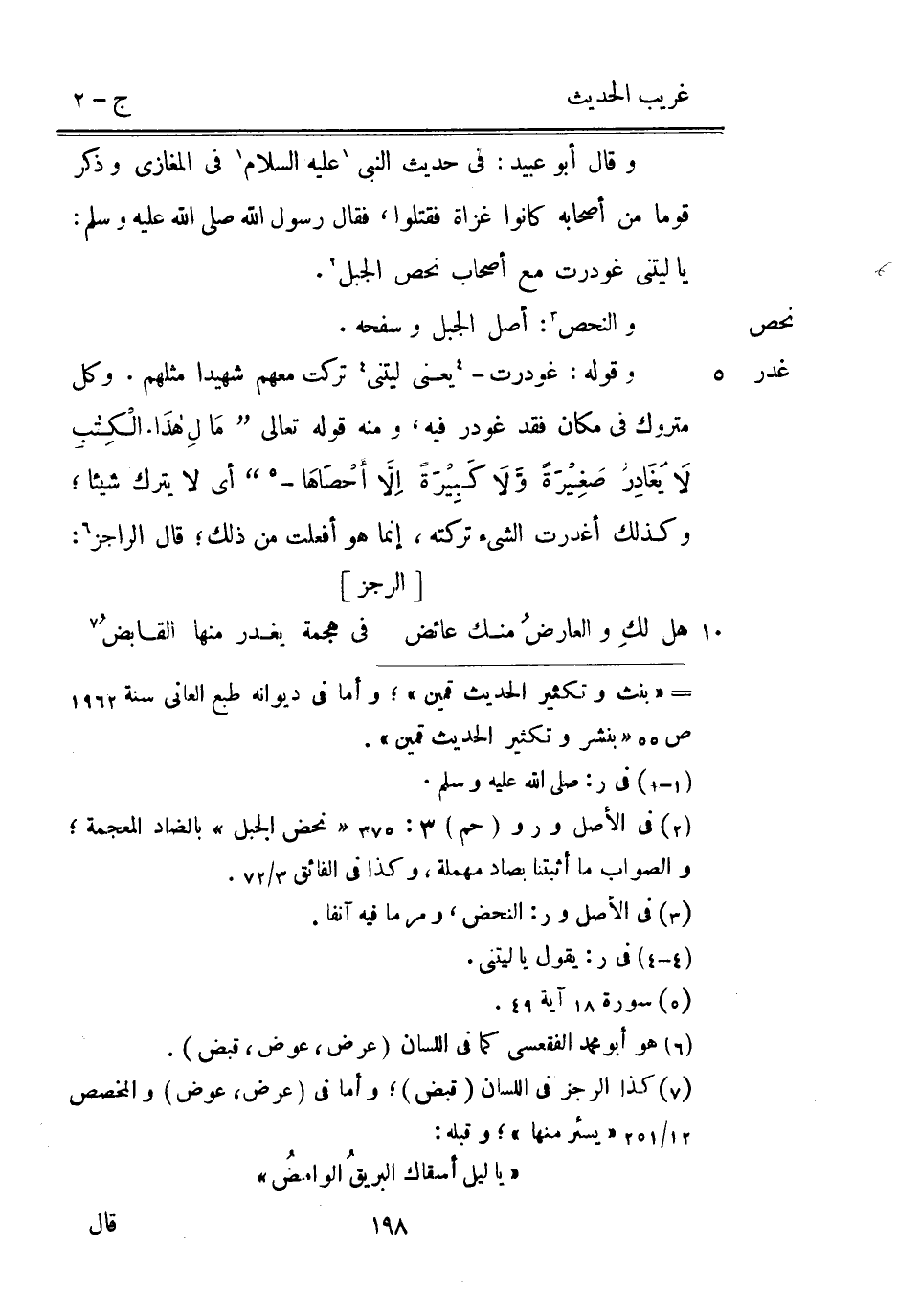 نحص غدر وَقَالَ أَبُو عبيد: فِي حَدِيث النَّبِي عَلَيْهِ السَّلَام فِي الْمَغَازِي وَذكر قوما من أَصْحَابه كَانُوا غزَاة فَقتلُوا فَقَالَ رَسُول اللَّه صلي اللَّه عَلَيْهِ وَسلم: يَا لَيْتَني غودرت مَعَ أَصْحَاب نحص الْجَبَل. والنحص: أصل الْجَبَل وسفحه. وَقَوله: غودرت يَعْنِي لَيْتَني تركت مَعَهم شَهِيدا مثلهم. وكل مَتْرُوك فِي مَكَان فقد غودر فِيهِ وَمِنْه قَوْله تَعَالَى {مَا لهَذَا الْكِتابِ لاَ يُغَادِرُ صَغِيْرَةً وَّلاَ كَبِيْرَةً إِلَّا أحْصَاهَا} أَي لَا يتْرك شَيْئا وَكَذَلِكَ أغدرت الشَّيْء تركته إِنَّمَا هُوَ أفعلت من ذَلِك قَالَ الراجز: