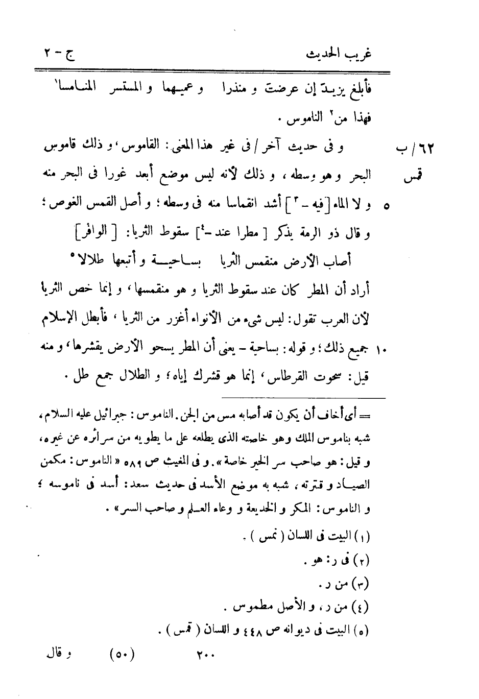 فَهَذَا من الناموس. 62 / ب وَفِي حَدِيث آخر / فِي غير هَذَا الْمَعْنى: الْقَامُوس وَذَلِكَ قَامُوس الْبَحْر وَهُوَ وَسطه وَذَلِكَ لِأَنَّهُ لَيْسَ مَوضِع أبعد غورا فِي الْبَحْر مِنْهُ وَلَا المَاء [فِيهِ -] أَشد انقماسا مِنْهُ فِي وَسطه وأصل القمس الغوص وَقَالَ ذُو الرمة يذكر [مَطَرا عِنْد -] سُقُوط الثريا: [الوافر]