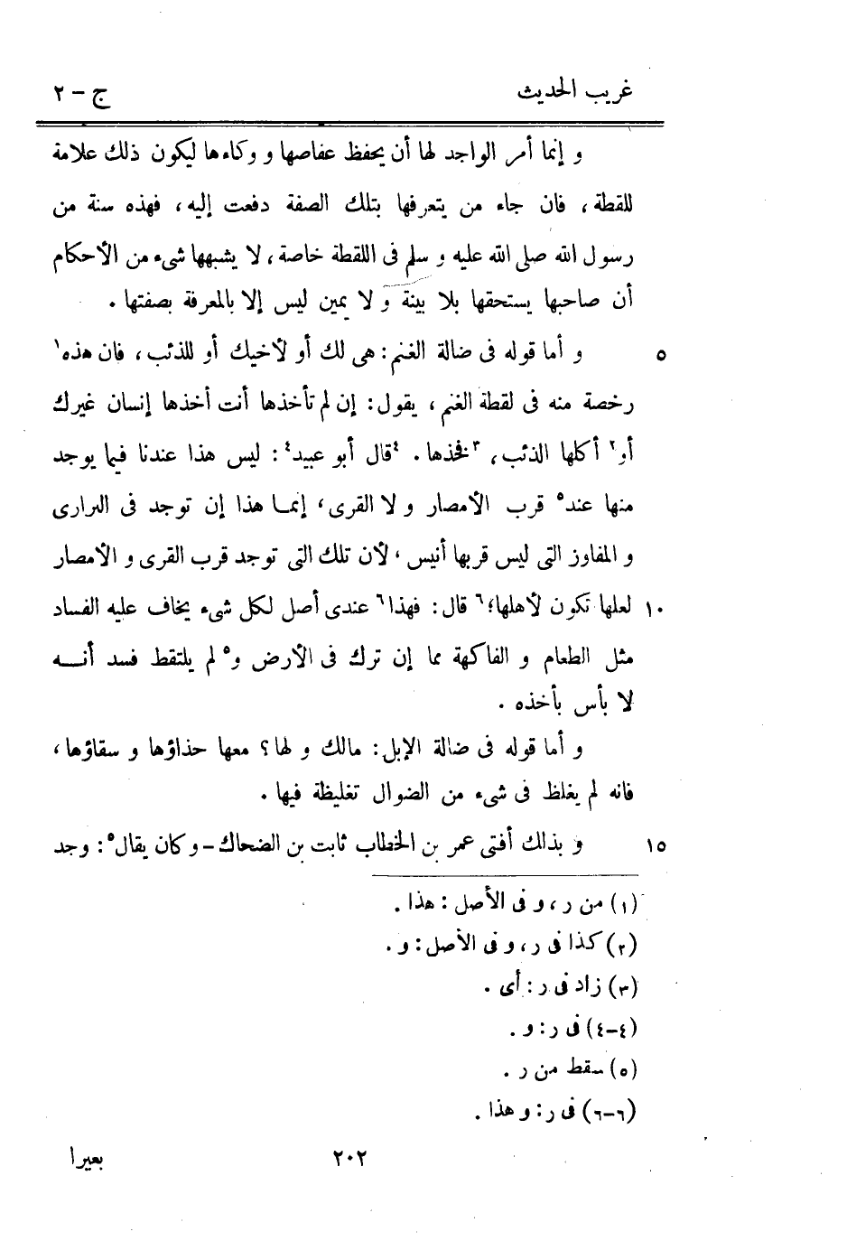 حذا سقى ميت أَتَى قَالَ أَبُو عُبَيْدٍ: لَيْسَ هَذَا عندنَا فِيمَا يُوجد مِنْهَا عِنْد قرب الْأَمْصَار وَلَا الْقرى إِنَّمَا هَذَا إِن تُوجد فِي البراري والمفاوز الَّتِي لَيْسَ قربهَا أنيس لِأَن تِلْكَ الَّتِي تُوجد قرب الْقرى والأمصار لَعَلَّهَا تكون لأَهْلهَا قَالَ: فَهَذَا عِنْدِي أصل لكل شَيْء يخَاف عَلَيْهِ الْفساد مثل الطَّعَام والفاكهة مِمَّا إِن ترك فِي الأَرْض ولم يلتقط فسد أَنه لَا بَأْس بِأَخْذِهِ. وَأما قَوْله فِي ضَالَّة الْإِبِل: مَالك وَلها مَعهَا حذاؤها وسقاؤها فَإِنَّهُ لم يغلظ فِي شَيْء من الضوال تغليظة فِيهَا. وَبِذَلِك أفتى عمر بْن الْخطاب ثَابت بْن الضَّحَّاك وَكَانَ يُقَال: وجد