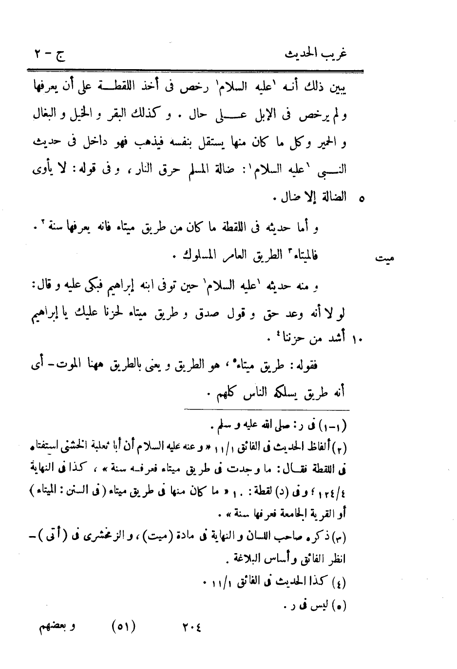 يبين ذَلِك أَنه عَلَيْهِ السَّلَام رخص فِي أَخذ اللّقطَة على أَن يعرفهَا وَلم يرخص فِي الْإِبِل على حَال. وَكَذَلِكَ الْبَقر وَالْخَيْل وَالْبِغَال وَالْحمير وكل مَا كَانَ مِنْهَا يسْتَقلّ بِنَفسِهِ فَيذْهب فَهُوَ دَاخل فِي حَدِيث النَّبِي عَلَيْهِ السَّلَام: ضَالَّة الْمُسلم حرق النَّار وَفِي قَوْله: لَا يأوي الضَّالة إِلَّا ضال. وَأما حَدِيثه فِي اللّقطَة مَا كَانَ من طَرِيق ميتاء فَإِنَّهُ يعرفهَا سنة. فالميتاء الطَّرِيق العامر المسلوك. وَمِنْه حَدِيثه عَلَيْهِ السَّلَام حِين توفّي ابْنه إِبْرَاهِيم فَبكى عَلَيْهِ وَقَالَ: لَوْلَا أَنه وعد حق وَقَول صديق وَطَرِيق ميتاء لحزنا عَلَيْك يَا إِبْرَاهِيم أَشد من حزننا. فَقَوله: طَرِيق ميتاء هُوَ الطَّرِيق وَيَعْنِي بِالطَّرِيقِ هَهُنَا الْمَوْت أَي أَنه طَرِيق يسلكه النَّاس كلهم.