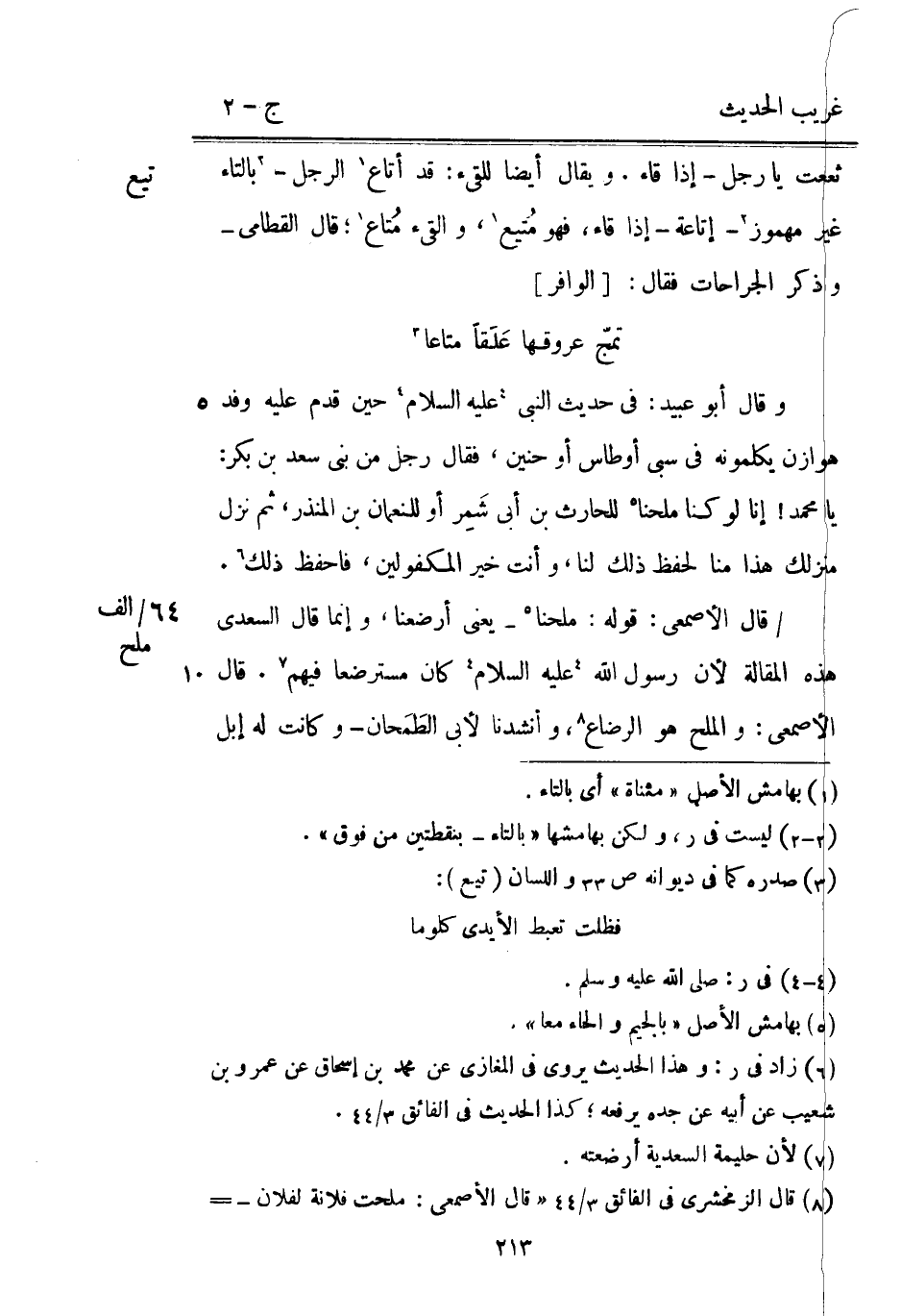 ملح وَقَالَ أَبُو عبيد: فِي حَدِيث النَّبِي عَلَيْهِ السَّلَام حِين قدم عَلَيْهِ وَفد هوَازن يكلمونه فِي سبي أَوْطَاس أَو حنين فقار رجل من بني سعد بْن بكر: يَا مُحَمَّد إِنَّا لَو كُنَّا ملحنا لِلْحَارِثِ بْن أبي شَمِر أَو للنعمان بْن الْمُنْذر ثمَّ نزل مَنْزِلك هَذَا منا لحفظ ذَلِك لنا وَأَنت خير المكفولين فاحفظ ذَلِك. / قَالَ الْأَصْمَعِي: قَوْله: ملحنا يَعْنِي أرضعنا وَإِنَّمَا قَالَ السَّعْدِيّ 64 / الف هَذِه الْمقَالة لِأَن رَسُول الله عَلَيْهِ السَّلَام كَانَ مسترضعا فيهم. قَالَ الْأَصْمَعِي: وَالْملح هُوَ الرَّضَاع وأنشدنا لأبي الطمحان وَكَانَت لَهُ إبل