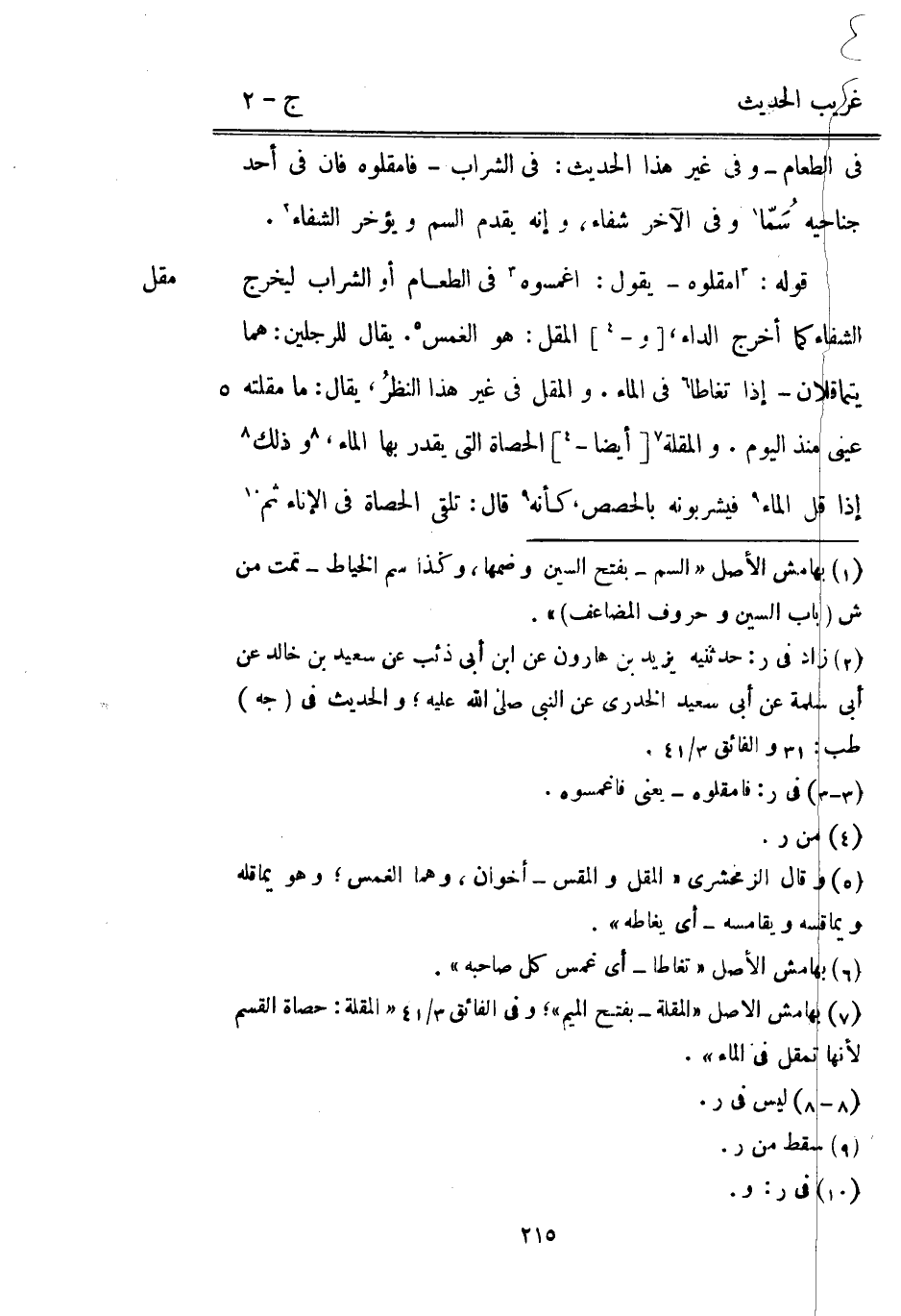 فِي الطَّعَام وَفِي غير هَذَا الحَدِيث: فِي الشَّرَاب فامقلوه فَإِن فِي أحد جناحيه سما (سُمَّا) وَفِي الآخر شِفَاء وَإنَّهُ يقدم السم وَيُؤَخر الشِّفَاء. قَوْله: امقلوه يَقُول: اغمسوه فِي الطَّعَام أَو الشَّرَاب ليخرج الشِّفَاء كَمَا أخرج الدَّاء [و -] الْمقل: هُوَ الغمس. يُقَال للرجلين: هما يتماقلان إِذا تغاطا فِي المَاء. والمقل فِي غير هَذَا النظرُ يُقَال: مَا مقلته عَيْني مُنْذُ الْيَوْم. والمقلة [أَيْضا -] الْحَصَاة الَّتِي يقدر بهَا المَاء وَذَلِكَ إِذا قل المَاء فيشربونه بِالْحِصَصِ كَأَنَّهُ قَالَ: تلقى الْحَصَاة فِي الْإِنَاء ثمَّ