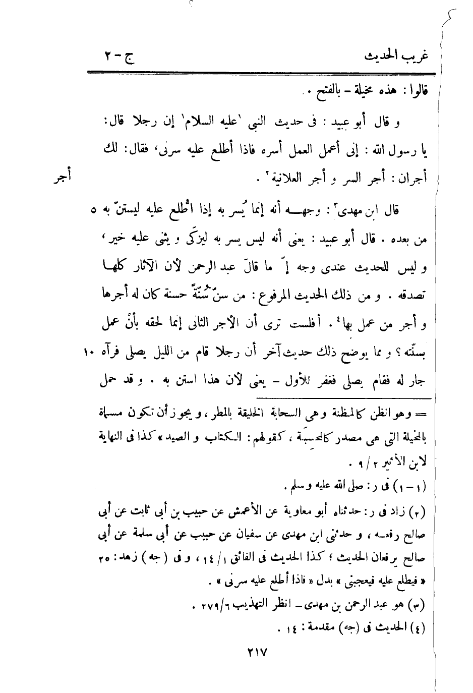 أجر وَقَالَ أَبُو عبيد: فِي حَدِيث النَّبِي عَلَيْهِ السَّلَام إِن رجلا قَالَ: يَا رَسُول اللَّه: إِنِّي أعمل الْعَمَل أسره فَإِذا أطلع عَلَيْهِ سرني فَقَالَ: لَك أَجْرَانِ: أجر السِّرّ وَأجر الْعَلَانِيَة. قَالَ ابْن مهْدي: وَجهه أَنه إِنَّمَا يُسر بِهِ إِذا اطُّلع عَلَيْهِ ليستنّ بِهِ من بعده. قَالَ أَبُو عبيد: يَعْنِي أَنه لَيْسَ يسر بِهِ ليزكّي ويثني عَلَيْهِ خير وَلَيْسَ للْحَدِيث عِنْدِي وَجه إِلَّا مَا قَالَ عبد الرَّحْمَن لِأَن الْآثَار كلهَا تصدقه. وَمن ذَلِك الحَدِيث الْمَرْفُوع: من سنّ سُنَّة حَسَنَة كَانَ لَهُ أجرهَا وَأجر من عمل بهَا. أفلست ترى أَن الْأجر الثَّانِي إِنَّمَا لحقه بأنْ عمل بسنّته وَمِمَّا يُوضح ذَلِك حَدِيث آخر أَن رجلا قَامَ من اللَّيْل يُصَلِّي فَرَآهُ جَار لَهُ فَقَامَ يُصَلِّي فغفر للْأولِ يَعْنِي لِأَن هَذَا اسْتنَّ بِهِ. وَقد حمل