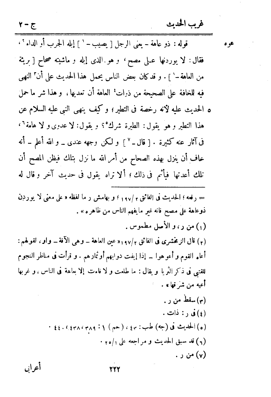 قَوْله: ذُو عاهة يَعْنِي الرجل [يُصِيب -] إبِله الْحَرْب أَو الدَّاء فَقَالَ: لَا يوردنها على مصح وَهُوَ الَّذِي إبِله وماشيته صِحَاح [بريئة من العاهة -] . وَقد كَانَ بعض النَّاس يحمل هَذَا الحَدِيث على أَن النَّهْي فِيهِ للمخافة على الصَّحِيحَة من ذَوَات العاهة أَن تعديها وَهَذَا شَرّ مَا حمل الحَدِيث عَلَيْهِ لِأَنَّهُ رخصَة فِي التطير وَكَيف ينْهَى النَّبِي عَلَيْهِ السَّلَام عَن هَذَا التطير وَهُوَ يَقُول: الطَّيرَة شرك وَيَقُول: لَا عدوى وَلَا هَامة فِي آثَار عَنهُ كَثِيرَة. [قَالَ -] وَلَكِن وَجهه عِنْدِي وَالله أعلم أَنه خَافَ أَن ينزل بِهَذِهِ الصِّحَاح من أَمر اللَّه مَا نزل بِتِلْكَ فيظن المصح أَن تِلْكَ أعدتها فيأثم فِي ذَلِك أَلا ترَاهُ يَقُول فِي حَدِيث آخر وَقَالَ لَهُ