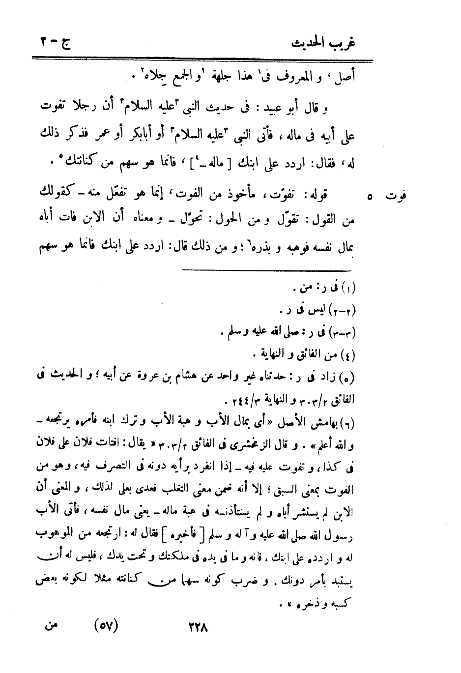 فَوت وَقَالَ أَبُو عبيد: فِي حَدِيث النَّبِي عَلَيْهِ السَّلَام أَن رجلا تفوت على أَبِيه فِي مَاله فَأتى النَّبِي عَلَيْهِ السَّلَام أَو أَبَا بكر أَو عمر فَذكر ذَلِك لَهُ فَقَالَ: ارْدُدْ علىابنك [مَاله -] فَإِنَّمَا هُوَ سهم من كنانتك. قَوْله: تفوت مَأْخُوذ من الْفَوْت إِنَّمَا هُوَ تفعّل مِنْهُ كَقَوْلِك من القَوْل: تَقول وَمن الْحول: تحوّل وَمَعْنَاهُ أَن الابْن فَاتَ أَبَاهُ بِمَال نَفسه فوهبه وبذره وَمن ذَلِك قَالَ: ارْدُدْ على ابْنك فَإِنَّمَا هُوَ سهم