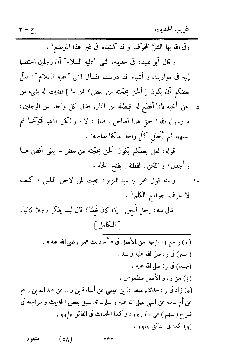 أَخا سهم وَقَالَ أَبُو عبيد: فِي حَدِيث النَّبِي عَلَيْهِ السَّلَام أَن رجلَيْنِ اخْتَصمَا إِلَيْهِ فِي مَوَارِيث وَأَشْيَاء قد درست فَقَالَ النَّبِي عَلَيْهِ السَّلَام: لعلَ بَعْضكُم أَن يكون [أَلحن بحجّته من بعض فَمن -] قضيت لَهُ بِشَيْء من حق أَخِيه فَإِنَّمَا أقطع لَهُ قِطْعَة من النَّار فَقَالَ كل وَاحِد من الرجلَيْن: يَا رَسُول الله حَقي هَذَا لصاحبي فَقَالَ: لَا وَلَكِن اذْهَبَا فَتَوَخَّيَا ثُمَّ اسْتَهِما ثُمَّ ليُحْلِلْ كل وَاحِد مِنْكُمَا صَاحبه. قَوْله: لَعَلَّ بَعْضكُم يكون أَلحن بحجّته من بعض يَعْنِي أفطن لَهَا وأجدل واللحن: الفطنة بِفَتْح الْحَاء. وَمِنْه قَول عمر بْن عبد الْعَزِيز: عجبت لمن لاحن النَّاس كَيفَ لَا يعرف جَوَامِع الْكَلم. يُقَال مِنْهُ: رجل لَحِن إِذا كَانَ فَطِنا قَالَ لبيد يذكر رجلا كَاتبا: