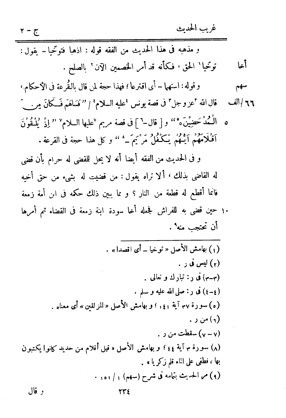 ومذهبه فِي هَذَا الحَدِيث من الْفِقْه قَوْله: اذْهَبَا فَتَوَخَّيَا يَقُول: توخيا الْحق فَكَأَنَّهُ قد أَمر الْخَصْمَيْنِ الْآن بِالصُّلْحِ. 66 / الف وَقَوله: اسْتهمَا أَي اقترعا فَهَذَا حجَّة لمن قَالَ بالقُرعة فِي الْأَحْكَام قَالَ اللَّه عز وَجل فِي قصَّة يُونُس عَلَيْهِ السَّلَام / {فساهم فَكَانَ من المدحضين} و [قَالَ -] فِي قصَّة مَرْيَم عَلَيْهَا السَّلَام {إذْ يُلْقُوْنَ اَقْلاَمَهُمْ أيُّهُمْ يَكْفُلُ مَرْيَمَ} وكل هَذَا حجَّة فِي الْقرعَة. وَفِي الحَدِيث من الْفِقْه أَيْضا أَنه لَا يحل للمقضي لَهُ حرَام بِأَن قضى لَهُ القَاضِي بذلك أَلا ترَاهُ يَقُول: من قضيت لَهُ بِشَيْء من حق أَخِيه فَإِنَّمَا أقطع لَهُ قِطْعَة من النَّار وَمِمَّا يبين ذَلِك حكمه فِي ابْن أمة زَمعَة حِين قضى بِهِ للْفراش فَجعله أَخا سَوْدَة ابْنة زَمعَة فِي الْقَضَاء ثمَّ أمرهَا أَن تحتجب مِنْهُ.