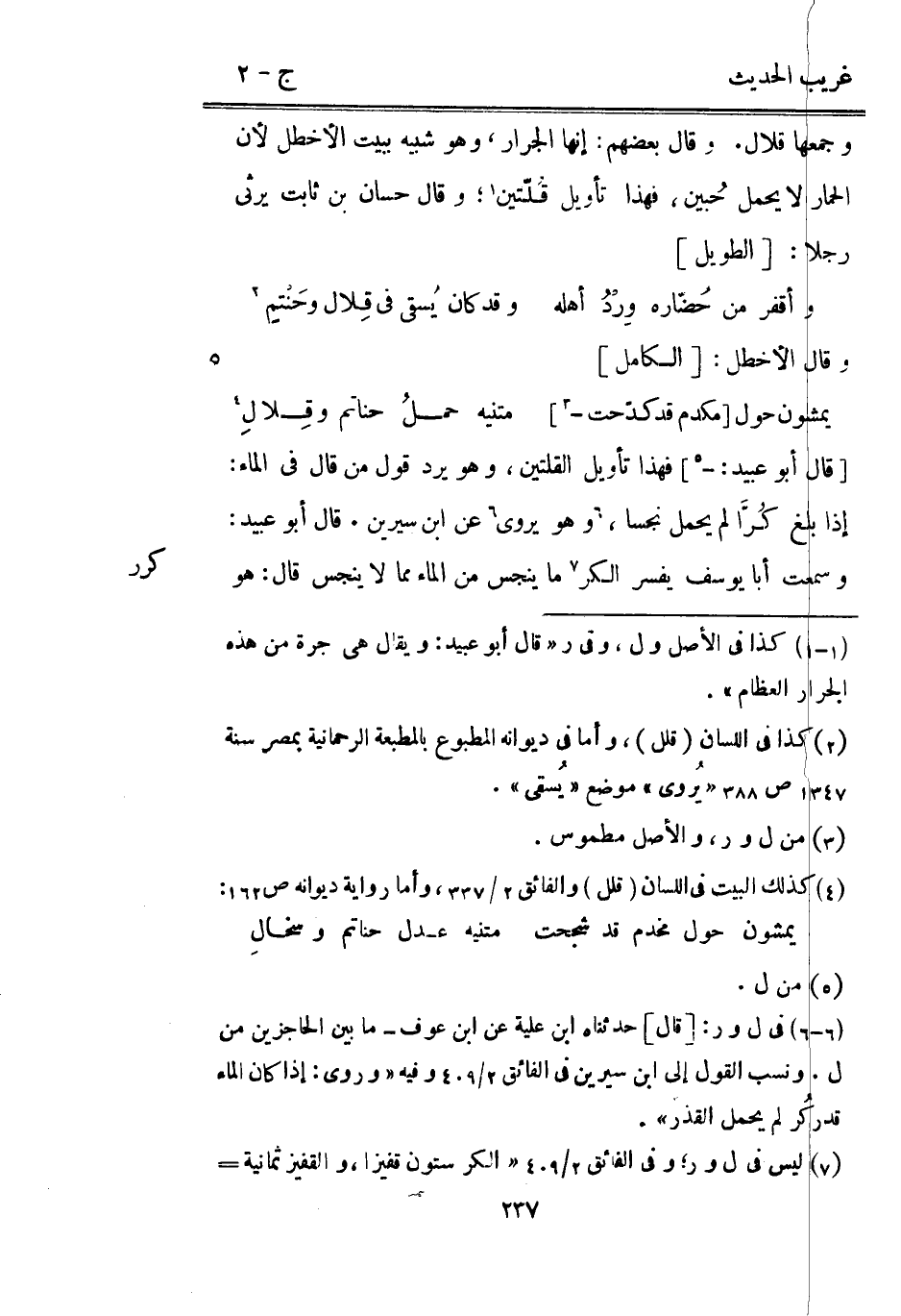 وَجَمعهَا قلال. وَقَالَ بَعضهم: إِنَّهَا الجرار وَهُوَ شَبيه بِبَيْت الأخطل لِأَن الْحمار لَا يحمل حُبين فَهَذَا تَأْوِيل قُلّتين وَقَالَ حسان بن ثَابت يرثى رجلا: [الطَّوِيل]