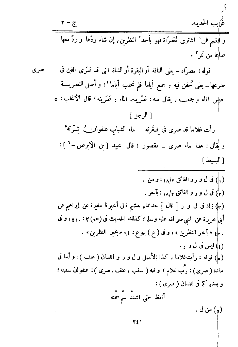 وَالْغنم فَمن اشْترى مُصَرّاة فَهُوَ بِأحد النظرين إِن شَاءَ ردّها وردّ مَعهَا صَاعا من تمر. قَوْله: مصراة يَعْنِي النَّاقة أَو الْبَقَرَة أَو الشَّاة الَّتِي قد صَرَى بهَا اللَّبن فِي ضرْعهَا يَعْنِي حُقن فِيهِ وَجمع أَيَّامًا فَلم تحلب أَيَّامًا وأصل التصرية حبس المَاء وَجمعه يُقَال مِنْهُ: صَرّيت المَاء وصريته قَالَ الْأَغْلَب: